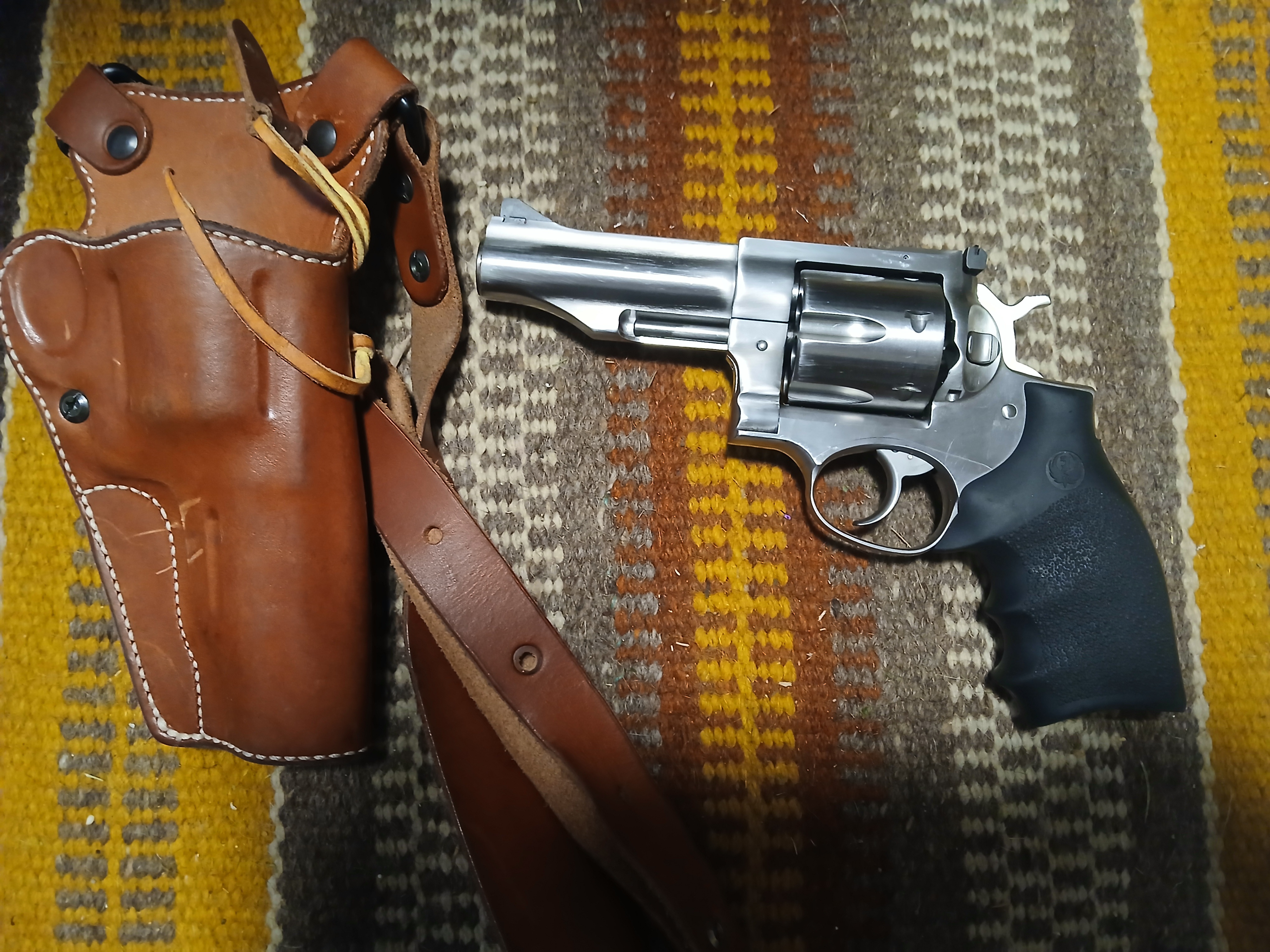 Fairly new Ruger Redhawk 4.2" 44 Mag. Comes with Diamond D Guides Choice chest rig and original case. Shot it about 100 times with sensible factory loads, has some holster wear. Bought it new last year.