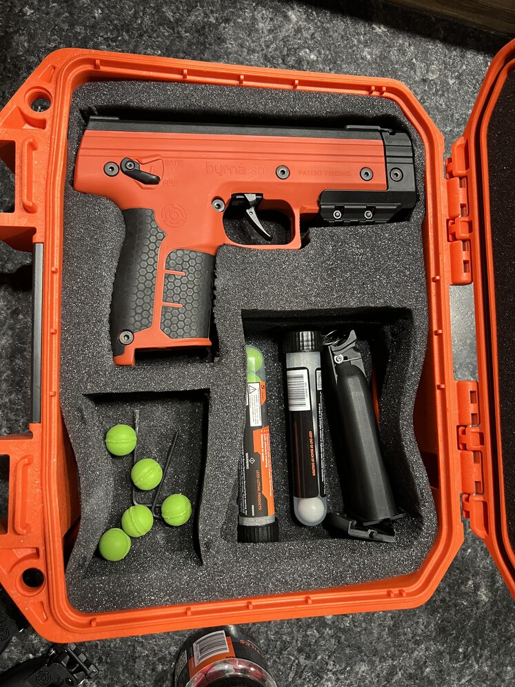 I have a BYRNA sd, comes with a really nice case, pepper balls, tear gas balls and target rounds. Has 3ea-7round mags and 3ea-5 round mags, also has an extension to allow bigger co2 cartridges and have a box off cartridges.