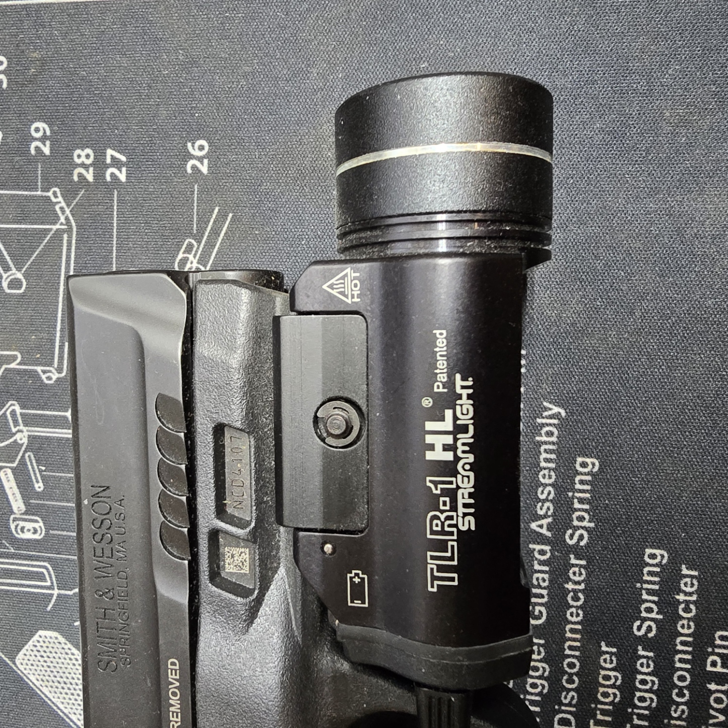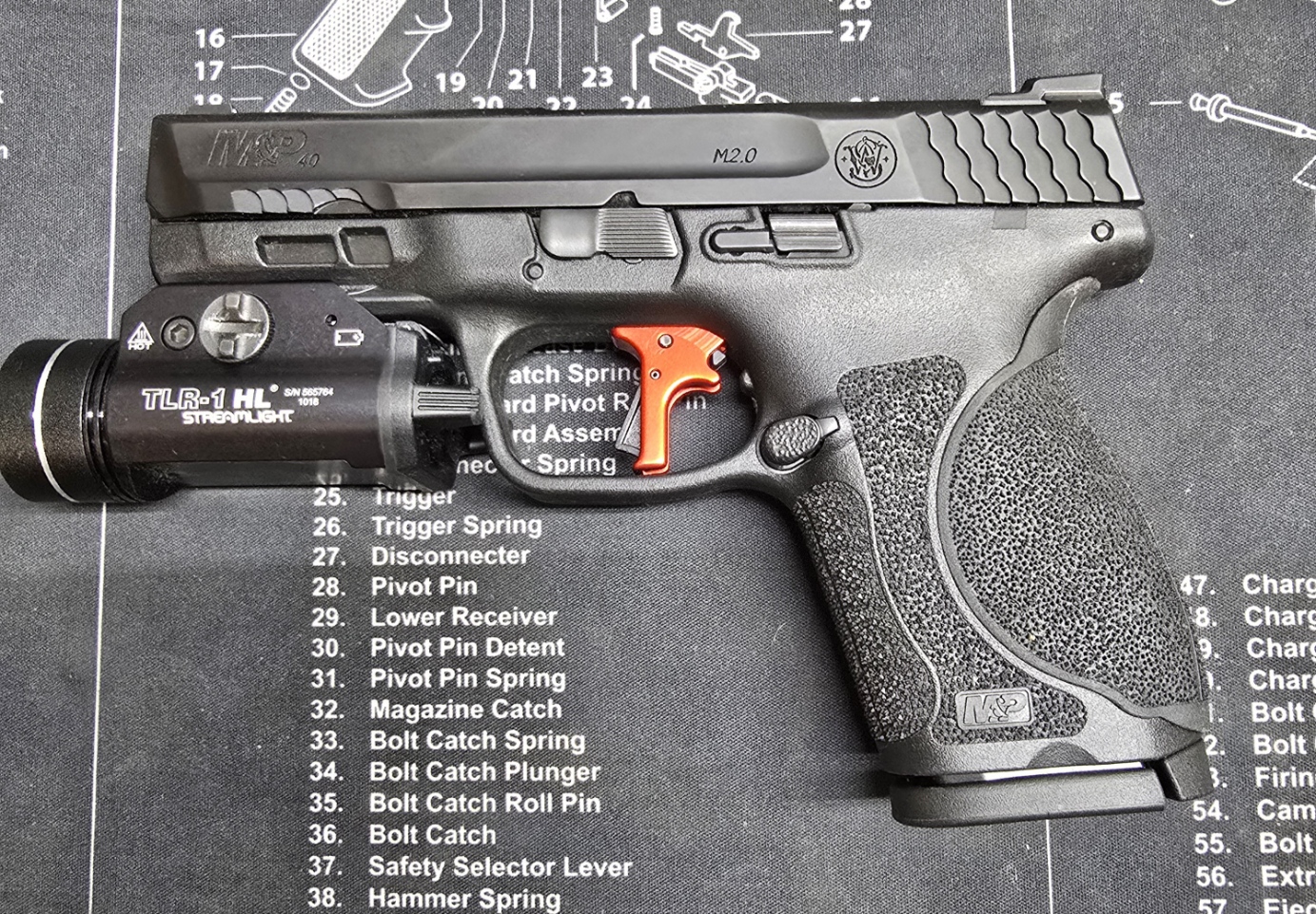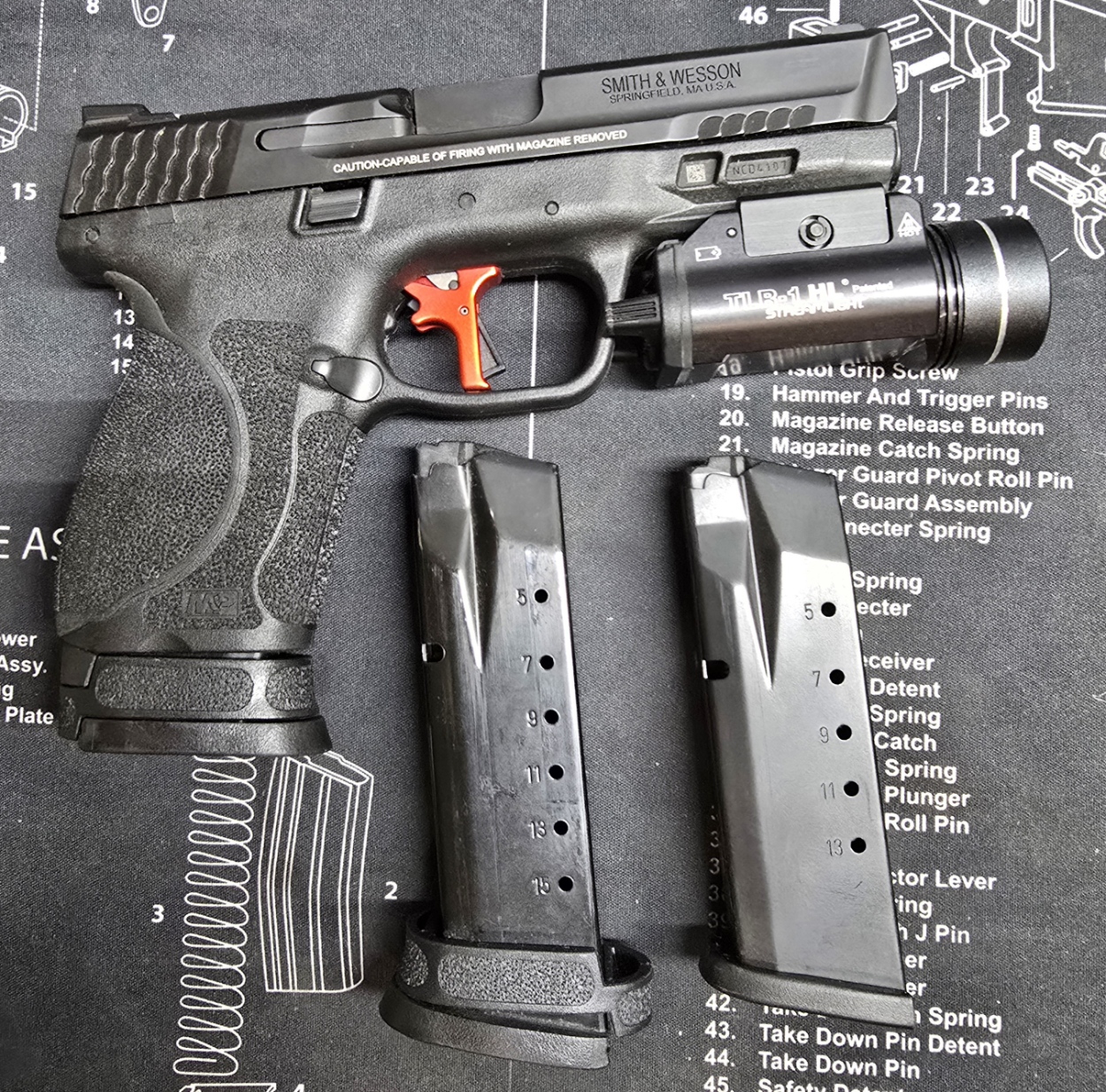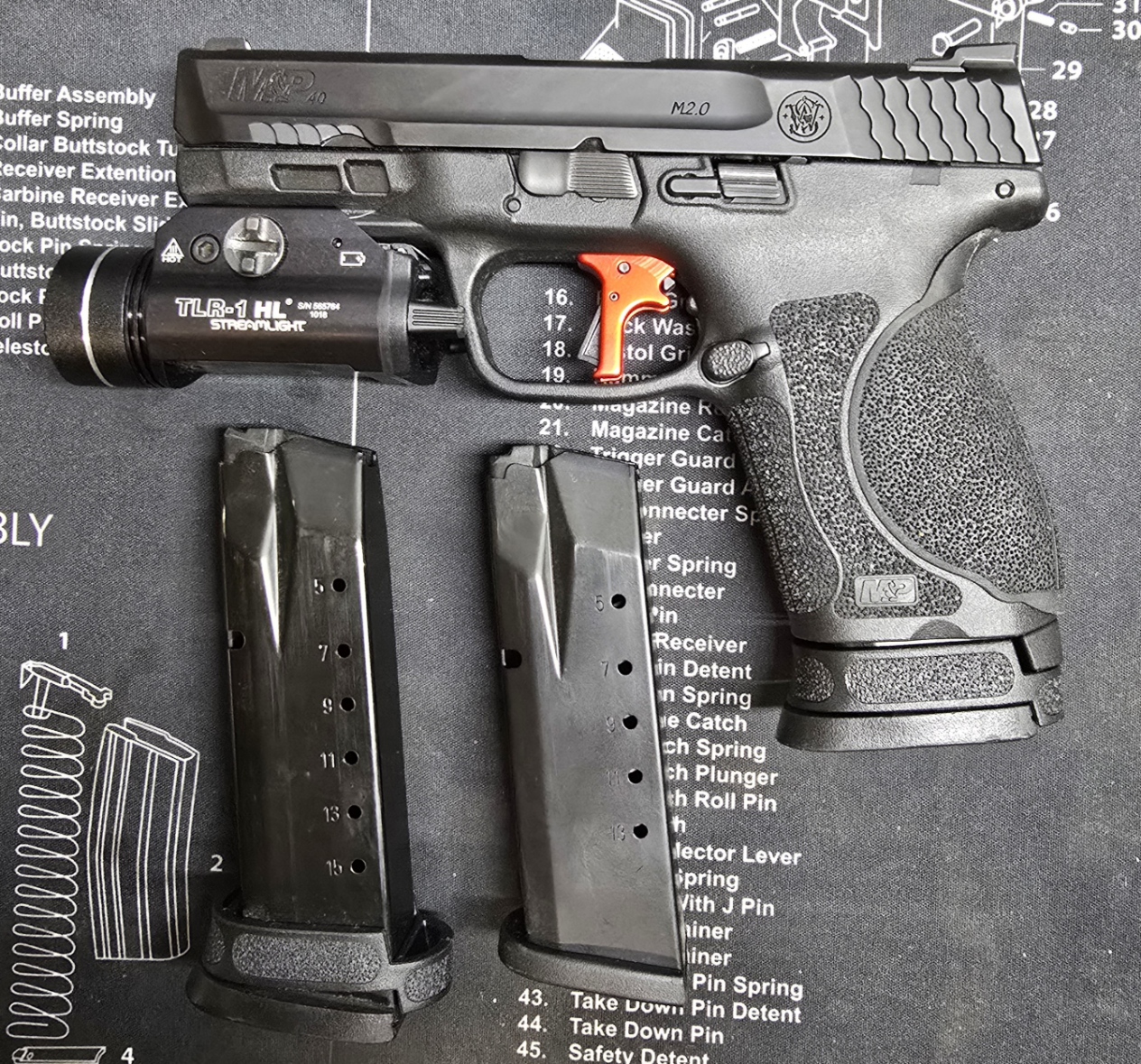 S&W M&P 40 compact, 4in. barrel, Apex forward set sear flat trigger in red, 1 13 round mag and 2 15 round mags. Streamlight TLR-1HL light with strobe function. Less than a hundred rounds down range.