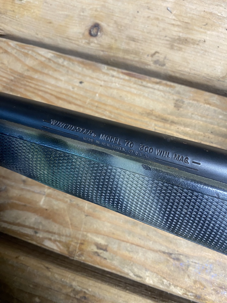 Winchester M70 Black Shadow.300 Winchester. Has been a wonderful rifle for me but I recently became the owner of something similar and no longer need this one. I believe these were originally sold by Walmart. They are one of the more affordable Model 70's out there. This one came to me in a trade and was Cerakoted and had a muzzle brake put on. I've owned it for ten years or so now and it's always performed exactly as you'd hope. The action is wonderfully smooth. It certainly is not perfect. but why would you want it to be. as a hunting rifle? The barrel is 26" (including the brake) Does NOT have a floor plate or a DBM I added the ghetto camo paint job that could easily be removed. The stock underneath is black plastic. Basic Nikon Prostaff 39x40 Scope with the BDC reticle I'll throw in a box of its favorite ammo. Contact Ryan to check it out. Thanks!