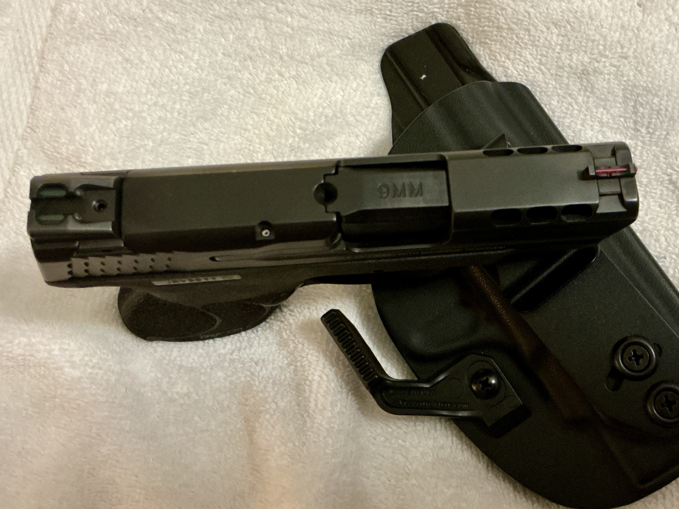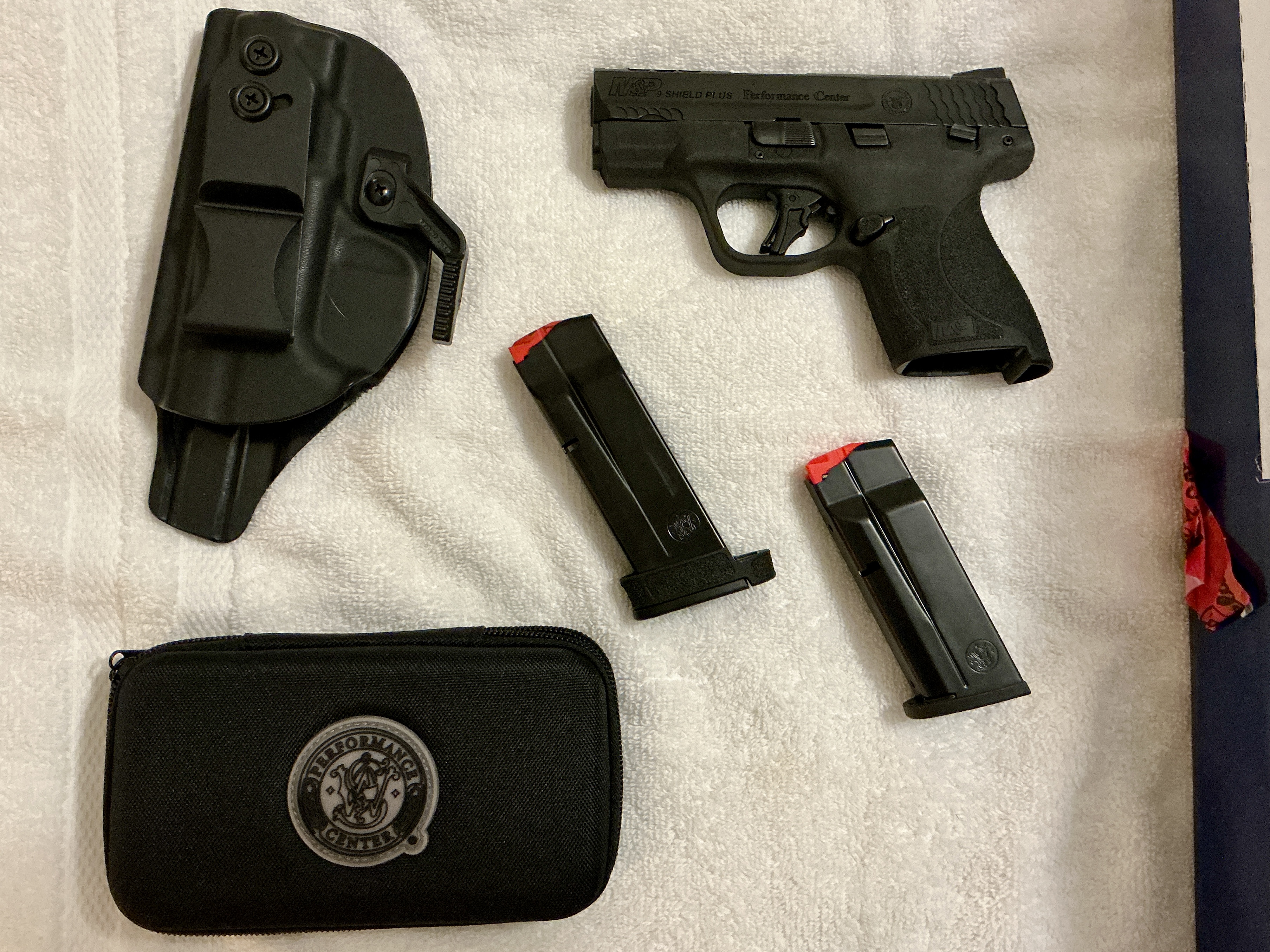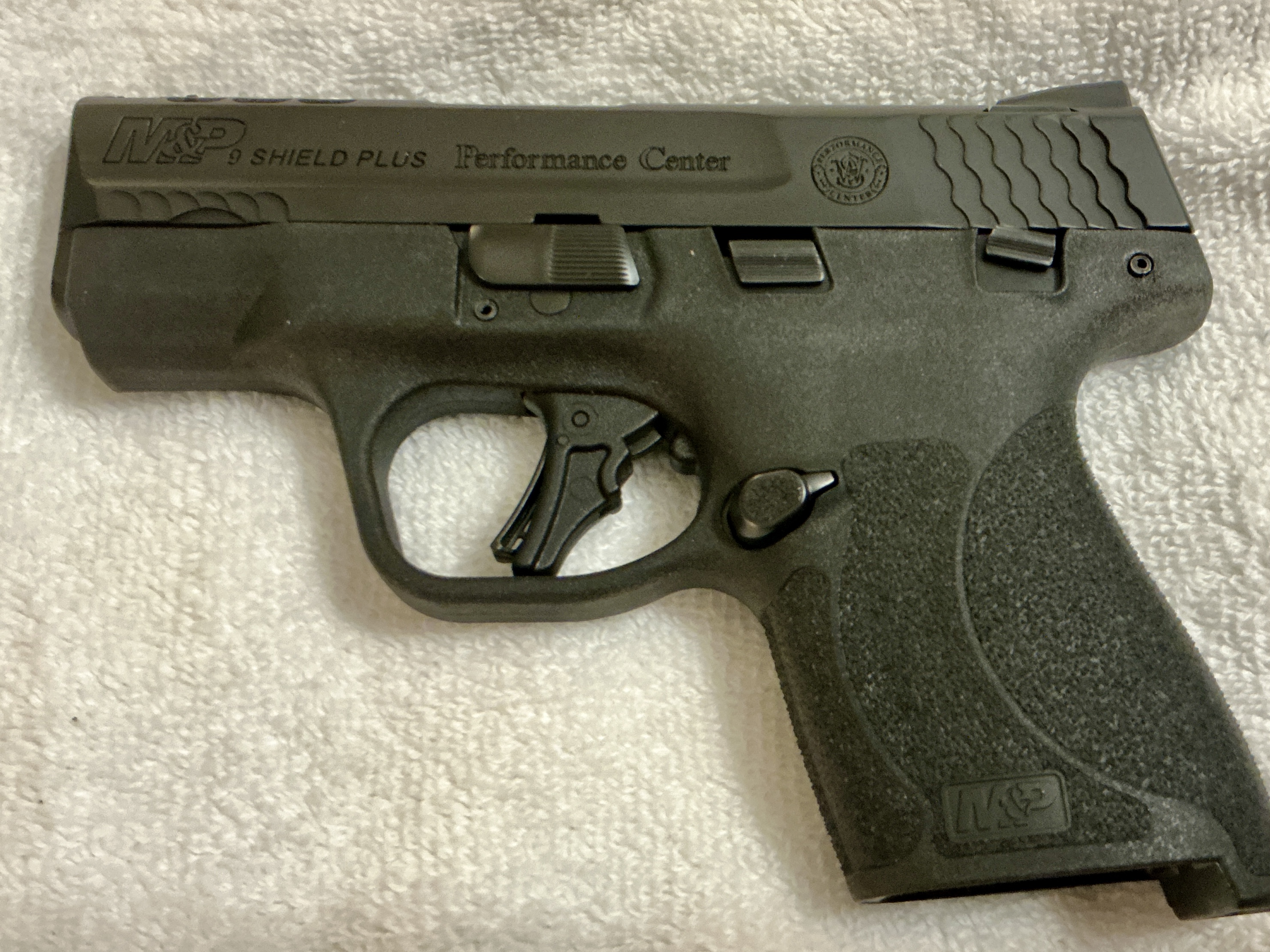Smith and Wesson Shield Plus Performance Center 9mm. This is the one with the ported barrel and ported slide. Less than 50 rounds. Factory sights replaced with Dawson Precision Perfect Impact fiber optic sights. Comes with Vedder IWB holster, 2 magazines, cleaning kit, original box. $650 obo Text only please, I have to keep my phone off at work. Serious buyers I will speak to on the phone if requested before meeting up.