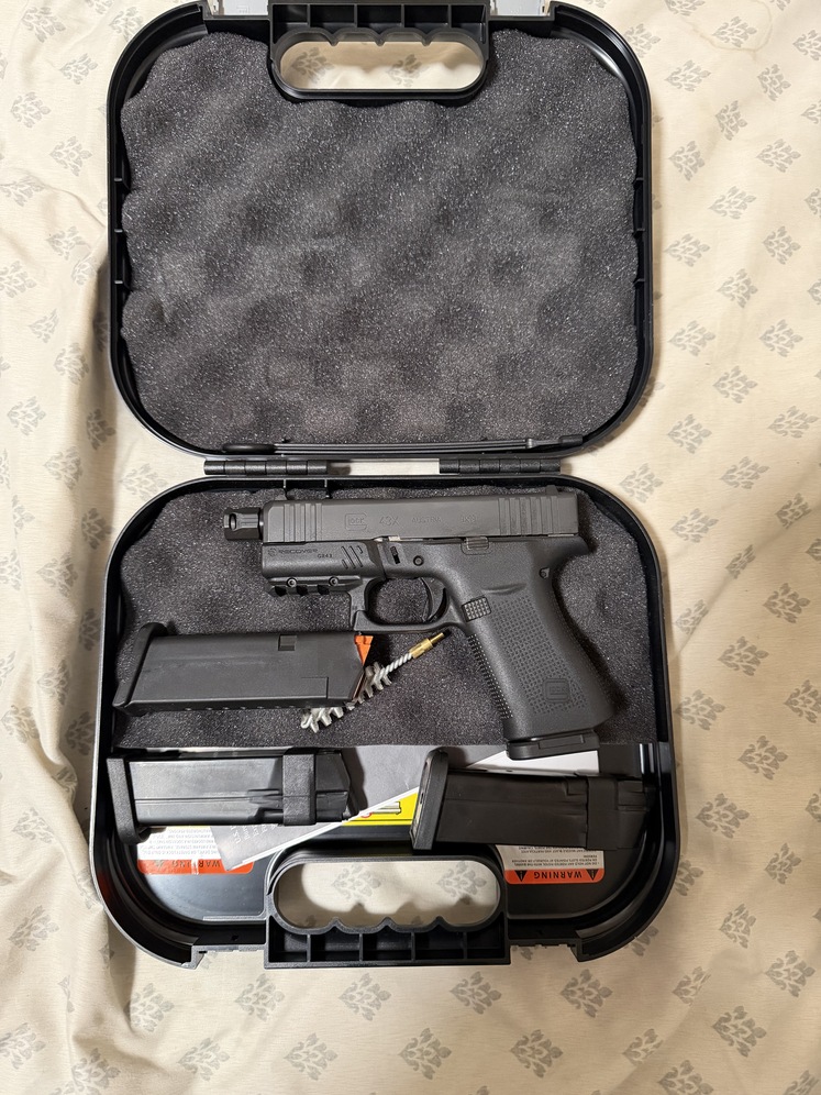 Glock 43X 9mm with muzzle brake and Shield Arms mag release. Comes with 4 mags (1 Glock 10 rnd , 1 Shield Arms 15 rnd, 2 generic 10 rnd). $550 obo, cash only no trades.