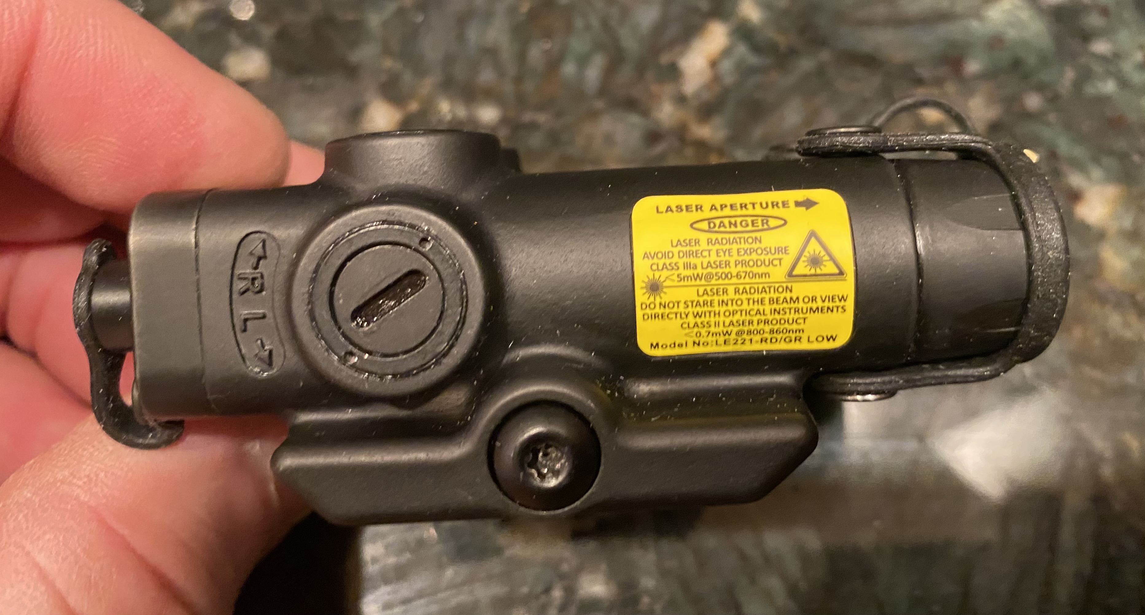 The LE221R is a class IIIa visible red laser aiming device with a coaxial mounted class 2 IR (infrared) laser for use with night vision devices. The LE221R features a grade 5 titanium housing with a quick release Picatinny rail mount. The LE221R is powered by a single CR123 battery which can provide up to 5000 hours of battery life.