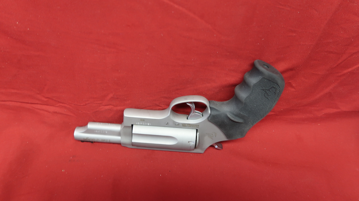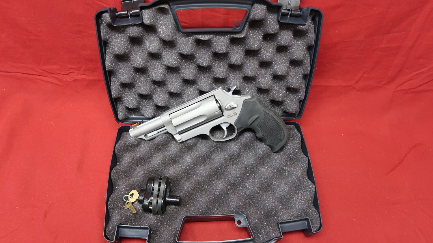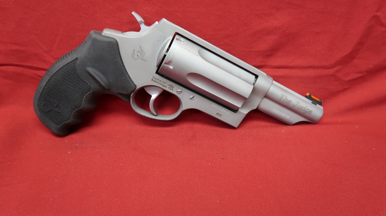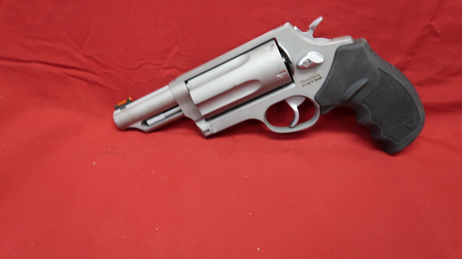 Taurus The Judge Magnum 45 Long Colt and 410 gauge 3". Matte stainless steel finish, spurred hammer, fiber optic front and fixed rear sight, rubber grips and has a transfer safety bar.This revolver has a 3" barrel and a 3" cylinder. If you consider that a semi-auto pistol barrel measurement includes the chamber then the revolver barrel would be 6". This revolver is in excellent condition. I am a federal firearms licensed dealer so a background check is required.