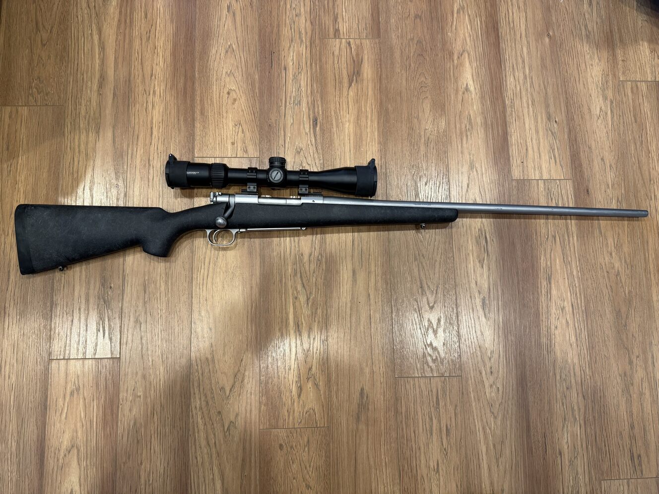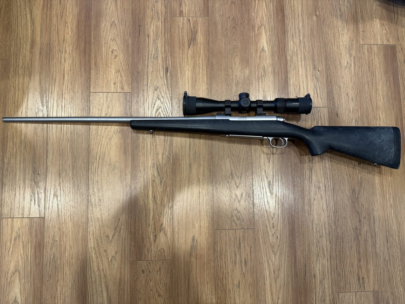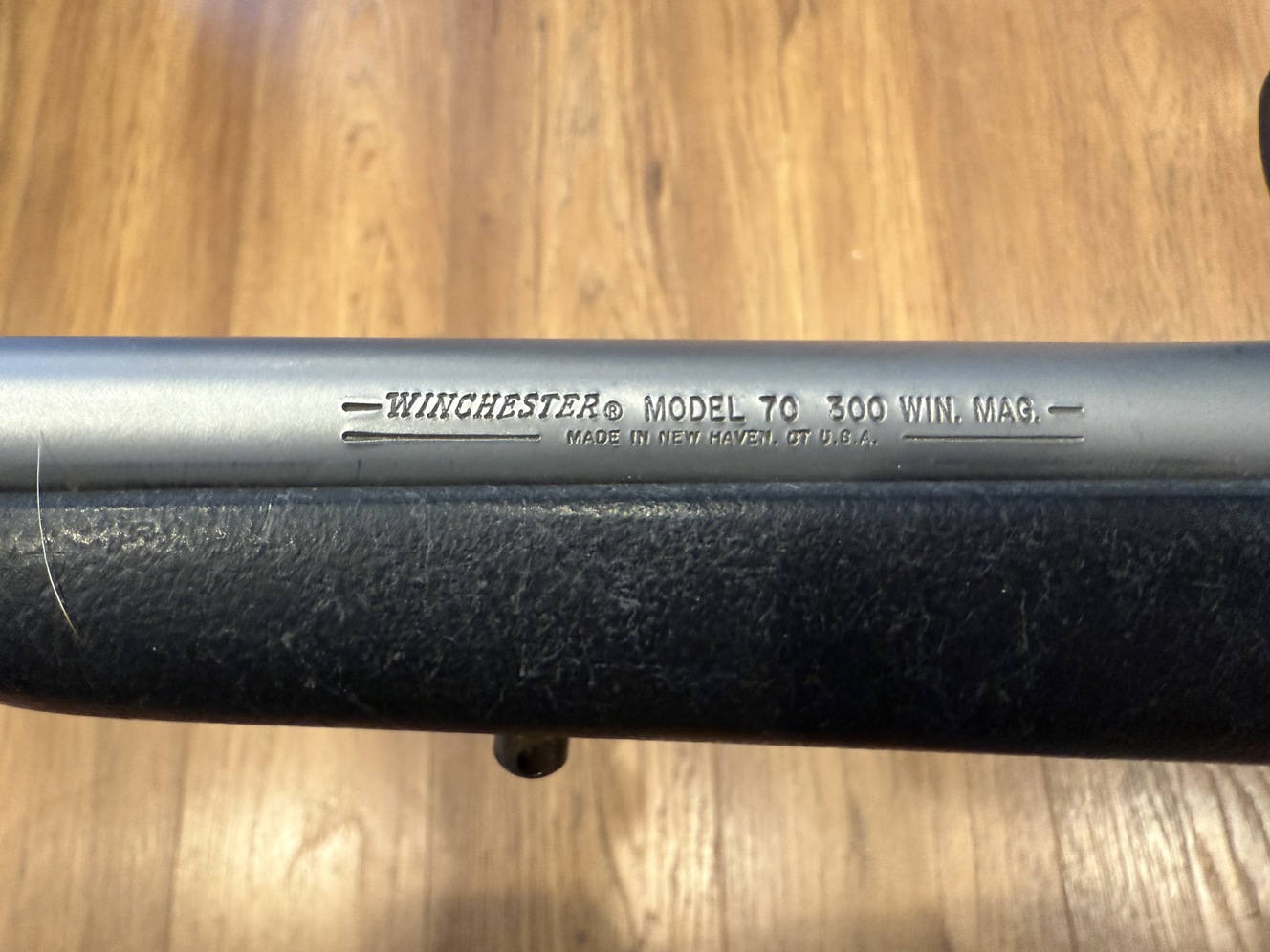 Winchester Model 70 Extreme Weather SS 300 Winchester Magnum. 26” barrel. 1 box of Federal 180 grain ammo included. Scope not included, but do have a Zeiss 3-9x40mm Conquest for sale as well. Exceptional bolt-action hunting rifle for adverse weather, Bell and Carlson stock, aluminum bedding block, matte stainless action and fluted barrel, M.O.A. trigger system, Pachmayr Decelerator recoil pad.
