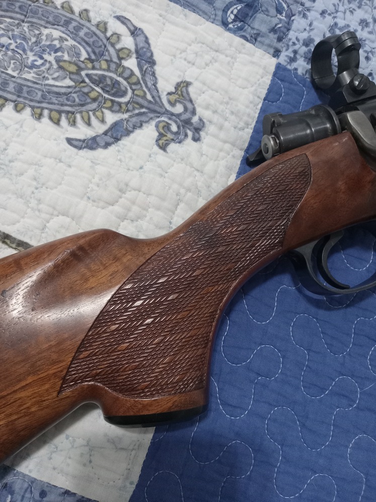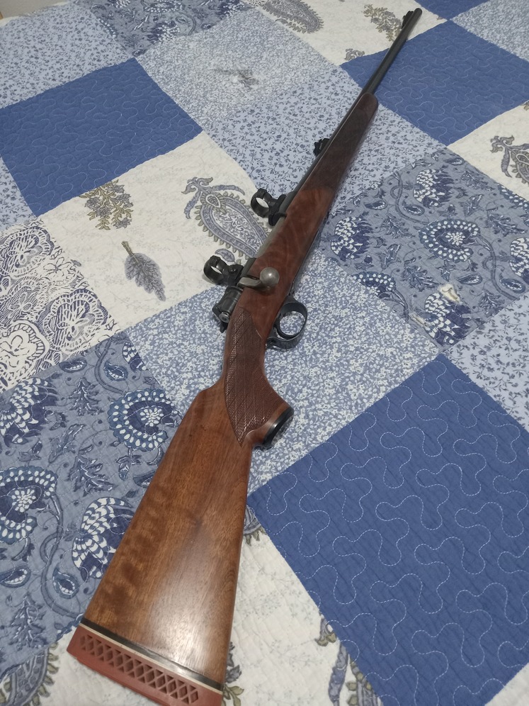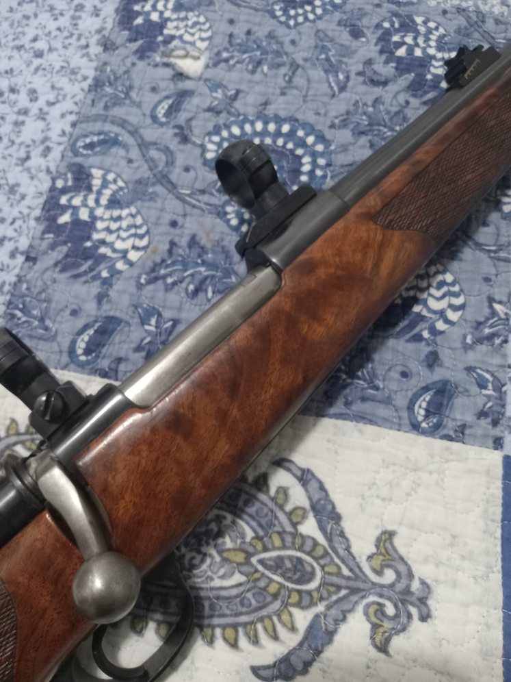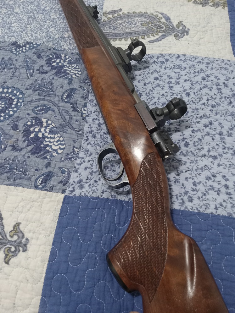 Mauser 98 chambered in 30-06. Control round feed, 22" barrel, open sights, Leupold scope rings, 98-99% bluing, Timney trigger, and absolutely beautiful wooden stock with finely executed skip line checkering. This would be nice addition to someone's collection. Merry Christmas!!!