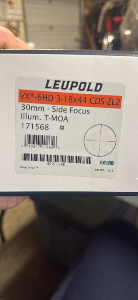 VX6 hd 3-18x44 cds-zl2 30mm Tmoa illuminated reticle. Glass is in perfect condition paid $1900 sell for $1,350 cash firm NO TRADES