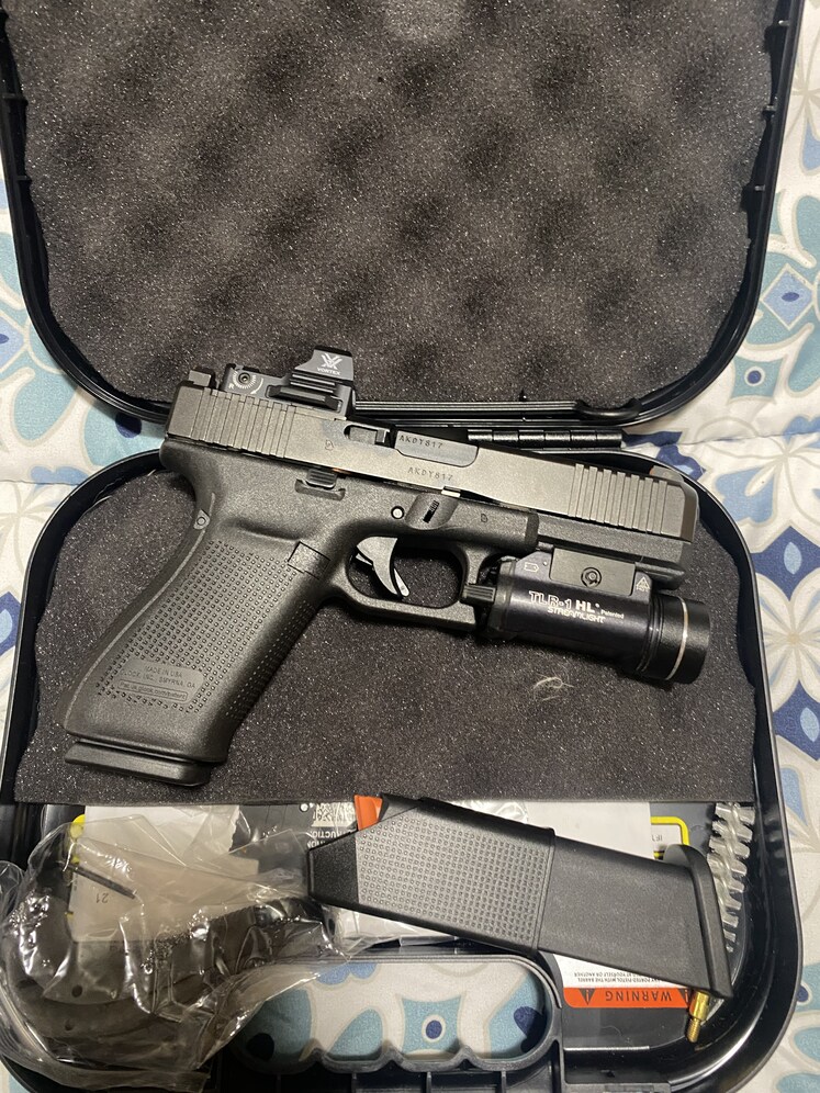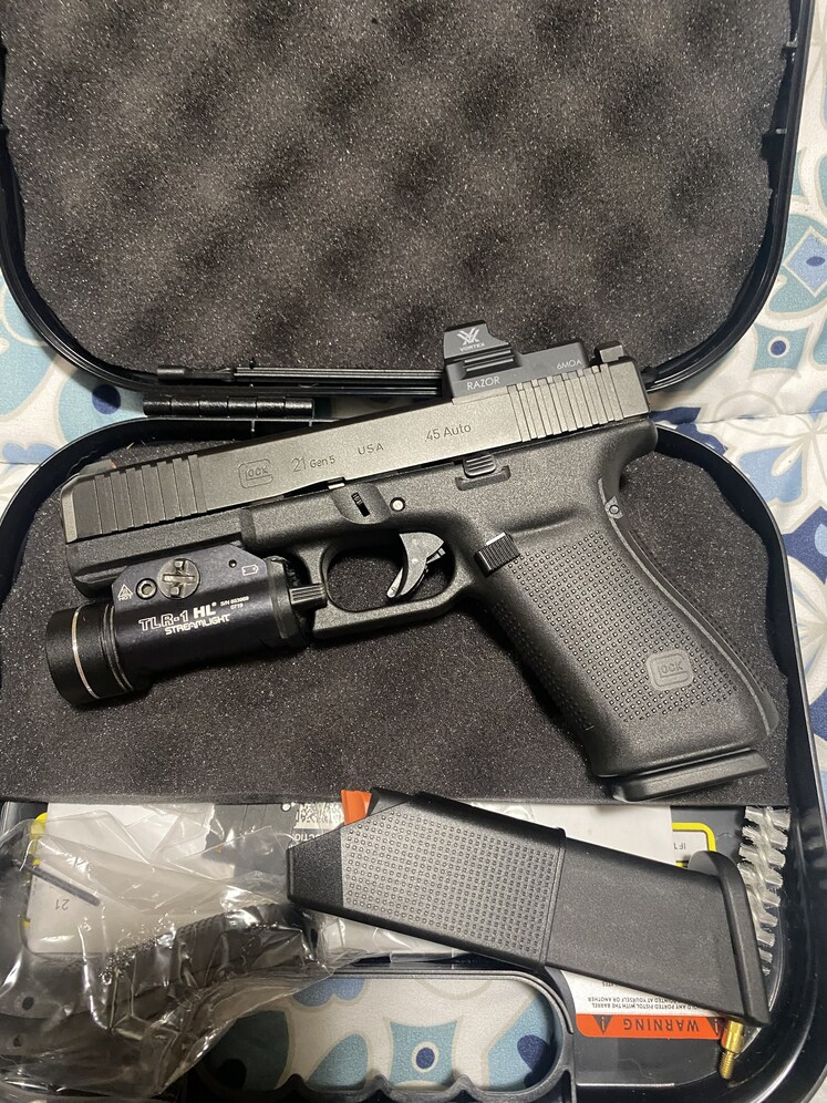 Glock 21 5th Gen 45 ACP MOS optics ready model. As new shape and brand new Suppressor height Trijicon HD night sights. Comes with box, paperwork, all back straps and 3 magazines. $600. It does NOT include the light or Vortex Razor red dot but are available if interested. Please call or text if interested 406-493-7904