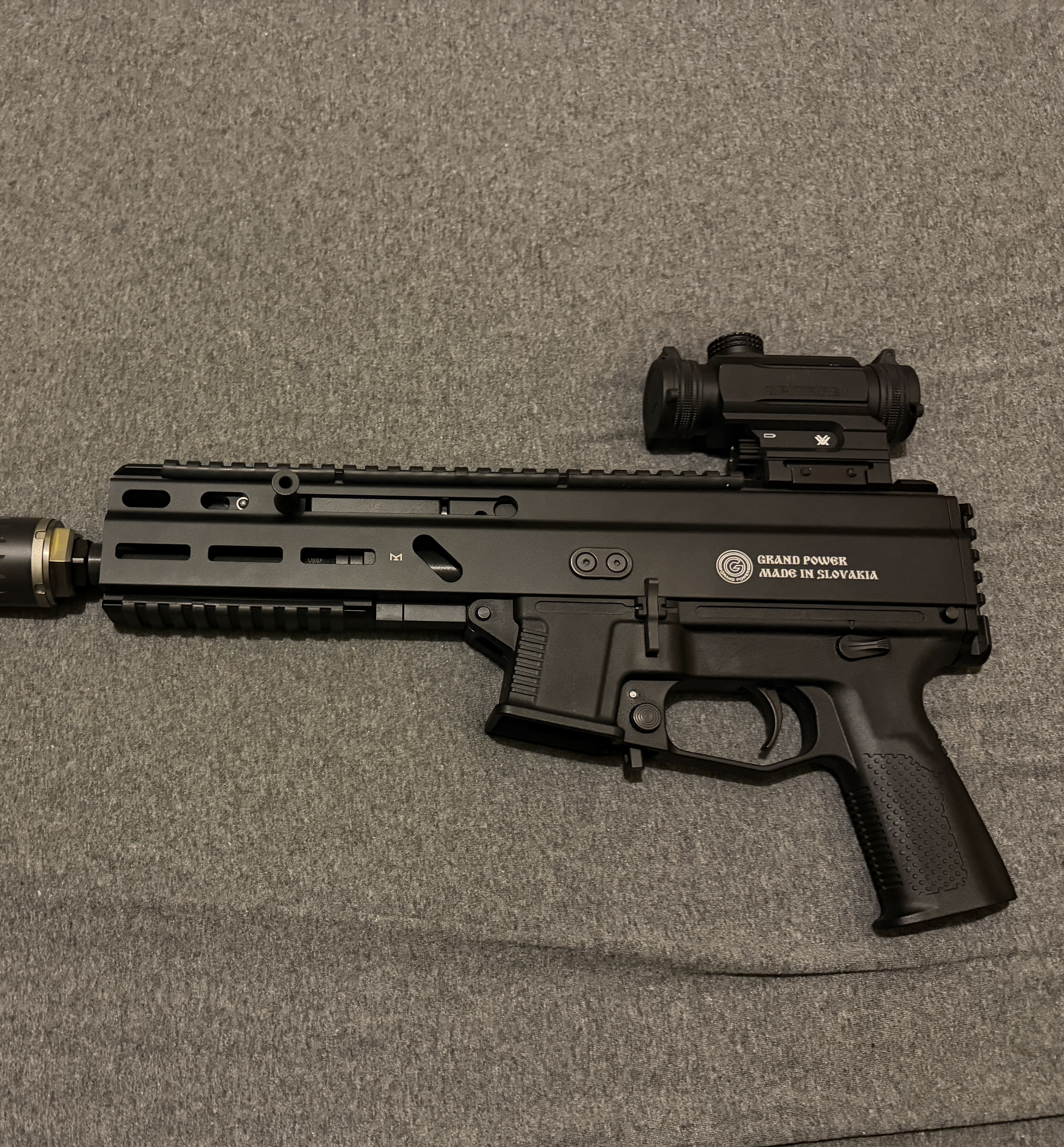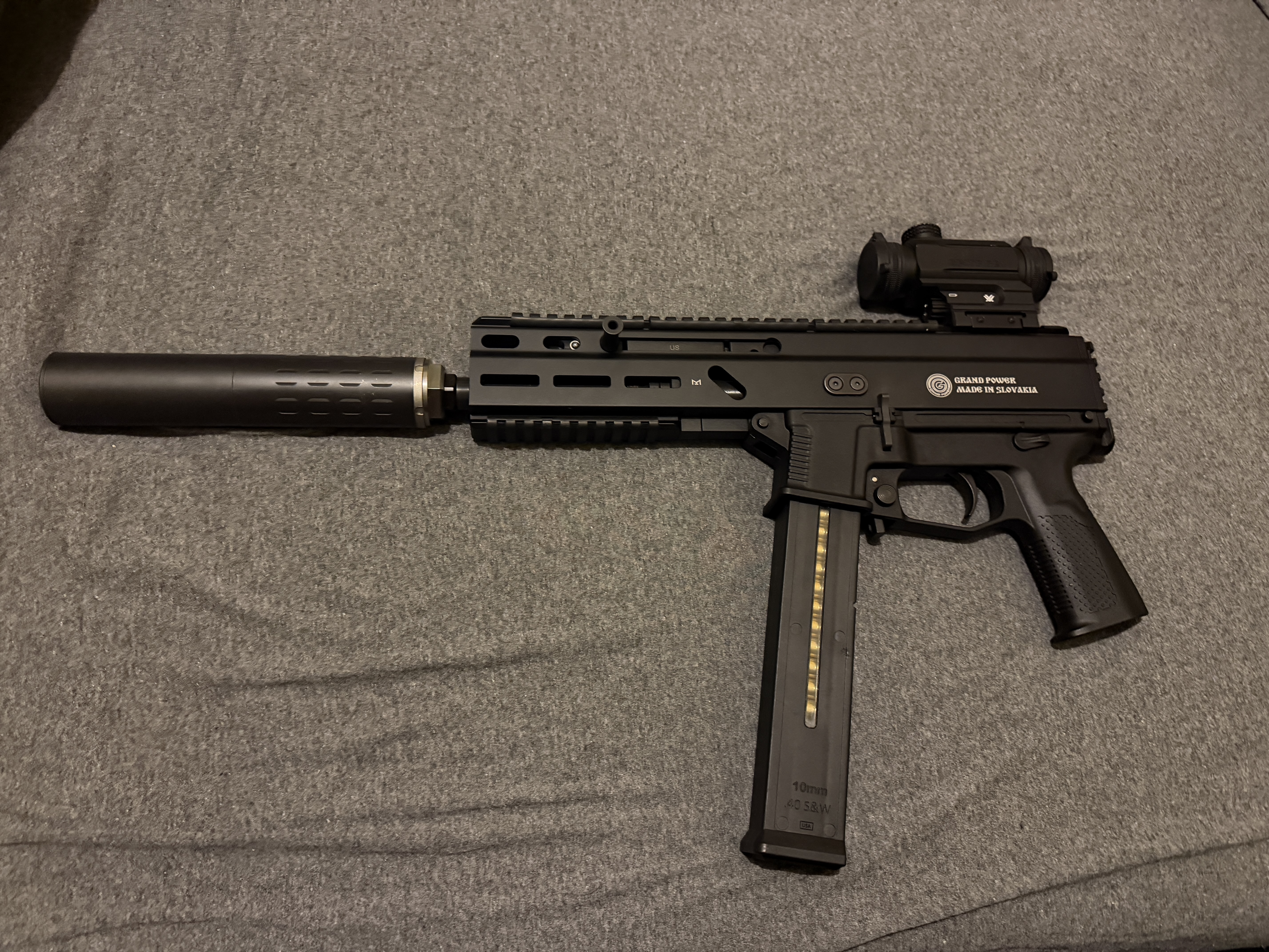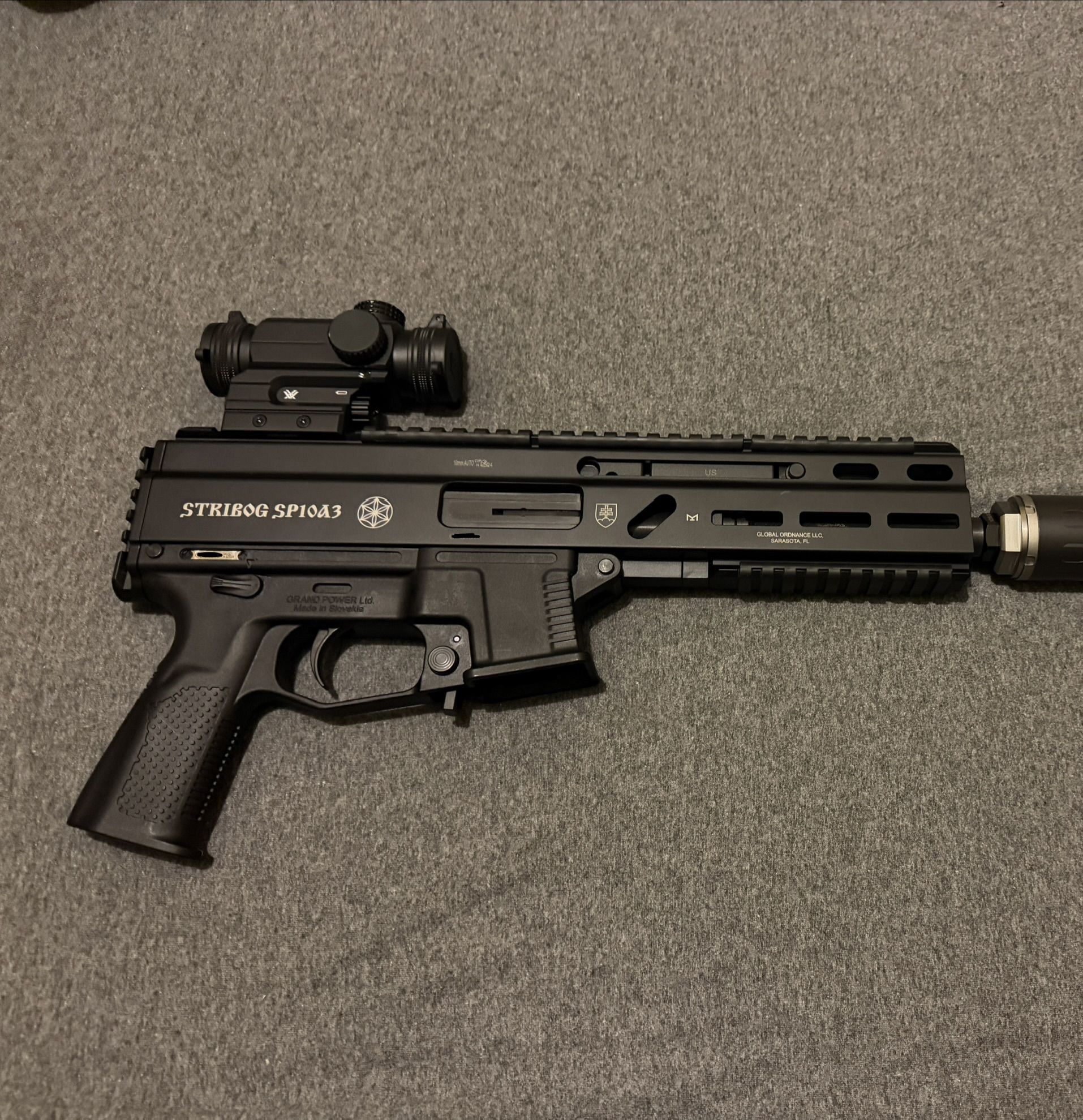 Grand Power Stribog SP10A3 10mm. Very clean and sparingly shot. One upgrade installed is an HB industries locking charging block. Only the gun is for sale. The suppressor is, of course, not included. The optic is not included (didnt want to take it off unless its sold). It comes with the 3 stock, translucent 20 round mags. The UMP magazine shown is not included (they were $150 each, custom retrofitted) Not interested in trades