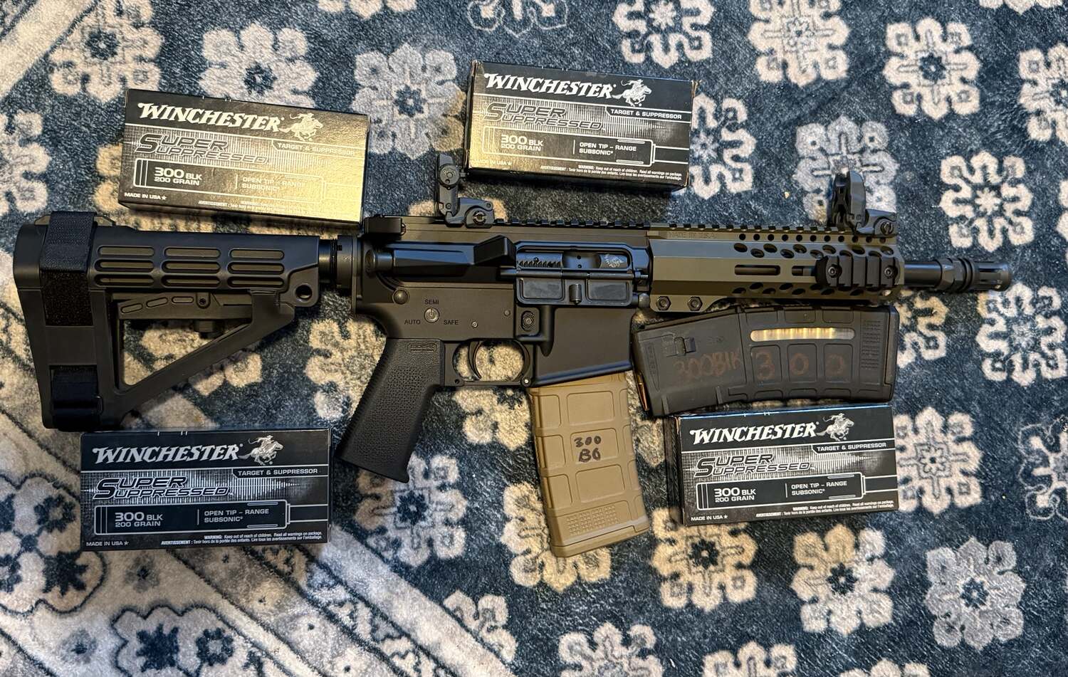 Custom built AR-15 torqued to specs Aero precision stripped upper Ballistic advantage 9” .300 blackout barrel SOLGW scalper BCG Geiselle airborne ambidextrous charging handle Magpul back up iron sights 7.5” m lok hand guard Aero precision buffer tube with pistol brace Palmetto state armory m4 government lower 2 mags and 140 rounds of 200 grain hollow point subsonic ammo