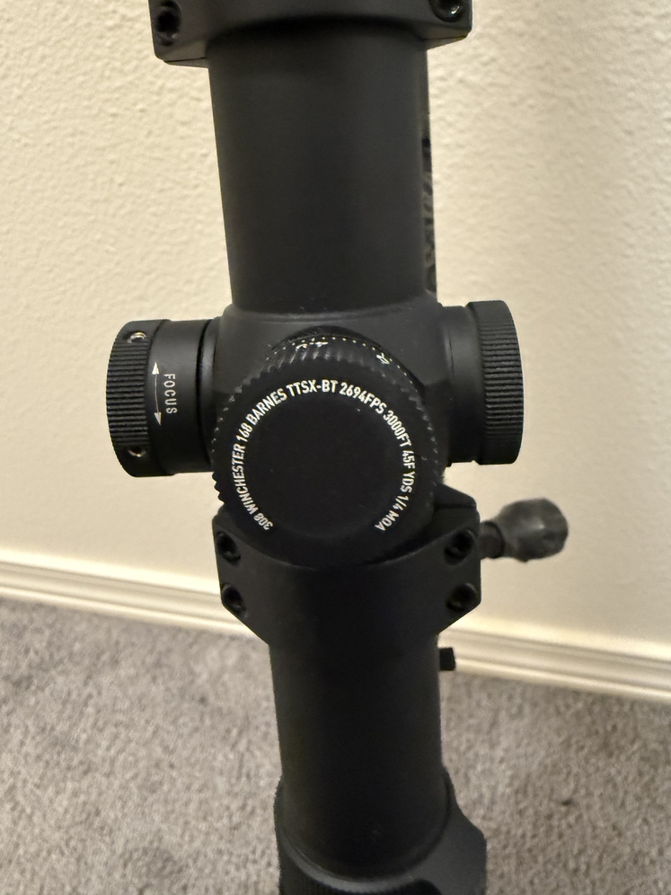 Leupold VX 3i 4.5-14x40 with alumina scope covers, mounted with Talley lightweight rings. Leupold CDS dial custom made for Barnes 168 gr TTCX BT ballistics.