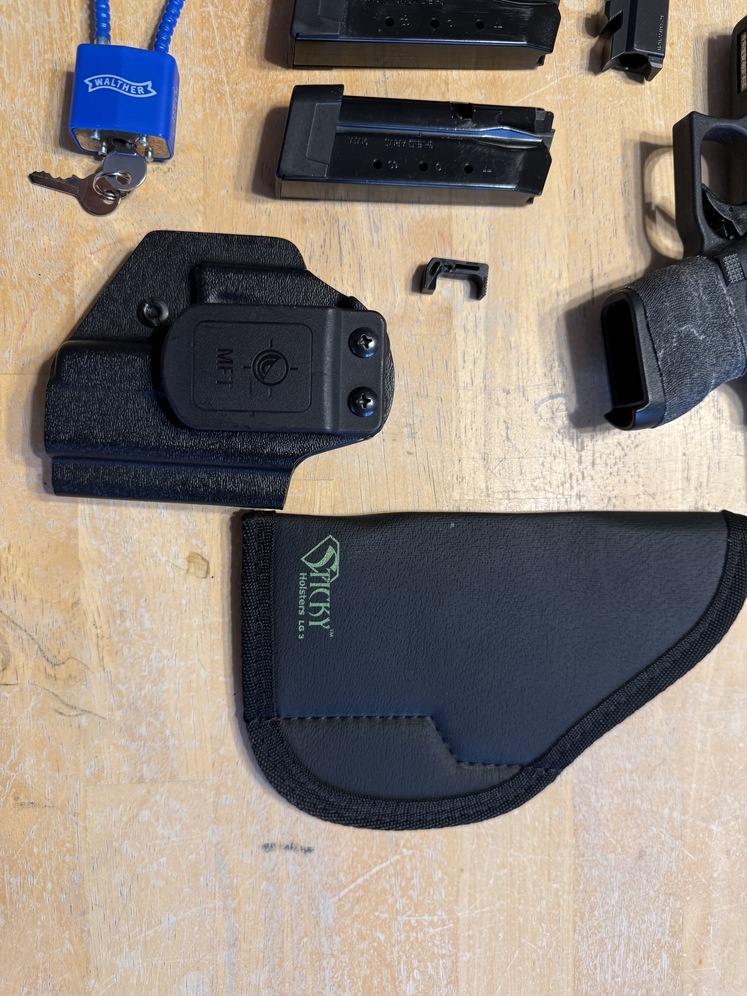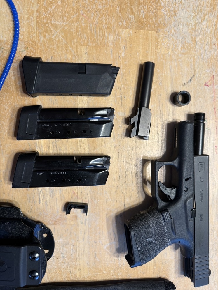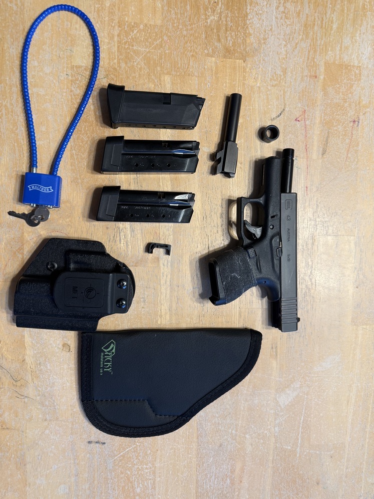 Moving out of state and want to sell it. Great gun and love the conceal ability of it. It comes with 2x 8 round magazines 1x 6 round magazine. Also comes with 2x barrels, one threaded and one non threaded. 2x IWB holsters. One lock. I also kept the plastic mag release. I put an extended aluminum mag release on.
