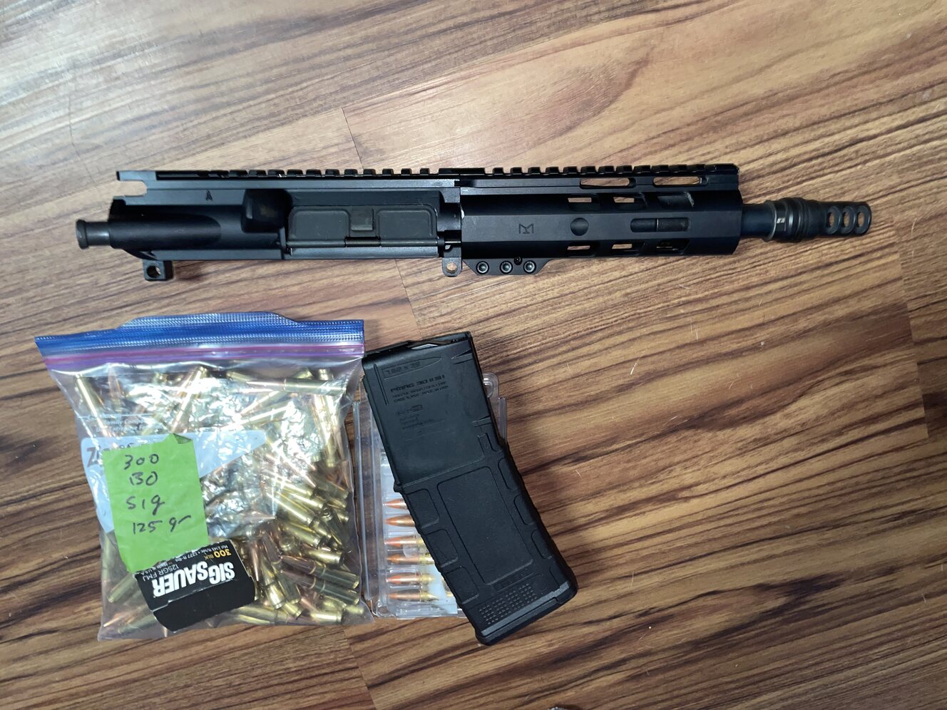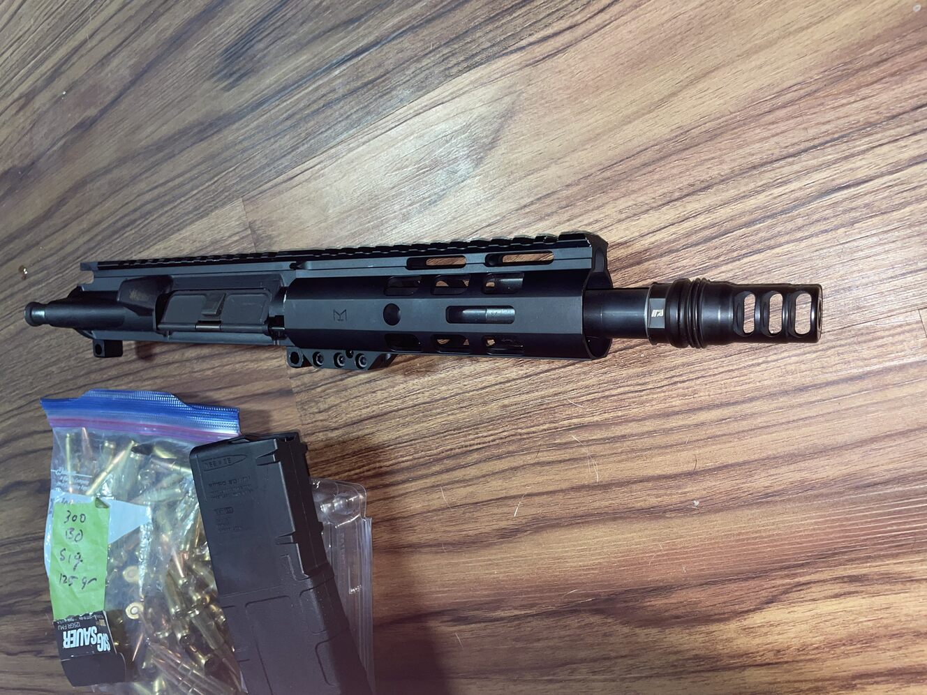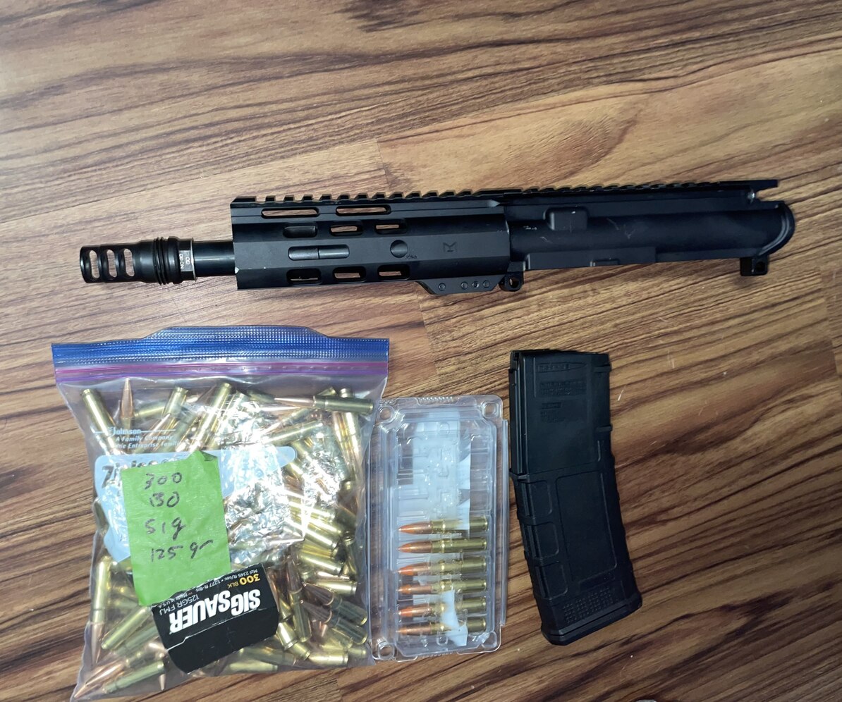 7.5 inch upper no BCG or CH. Has a rugged suppressors 3 port .30 Cal muzzle brake. Also 130 Rounds of 300 blackout ammo plus one Magazine. Welcome to trades.