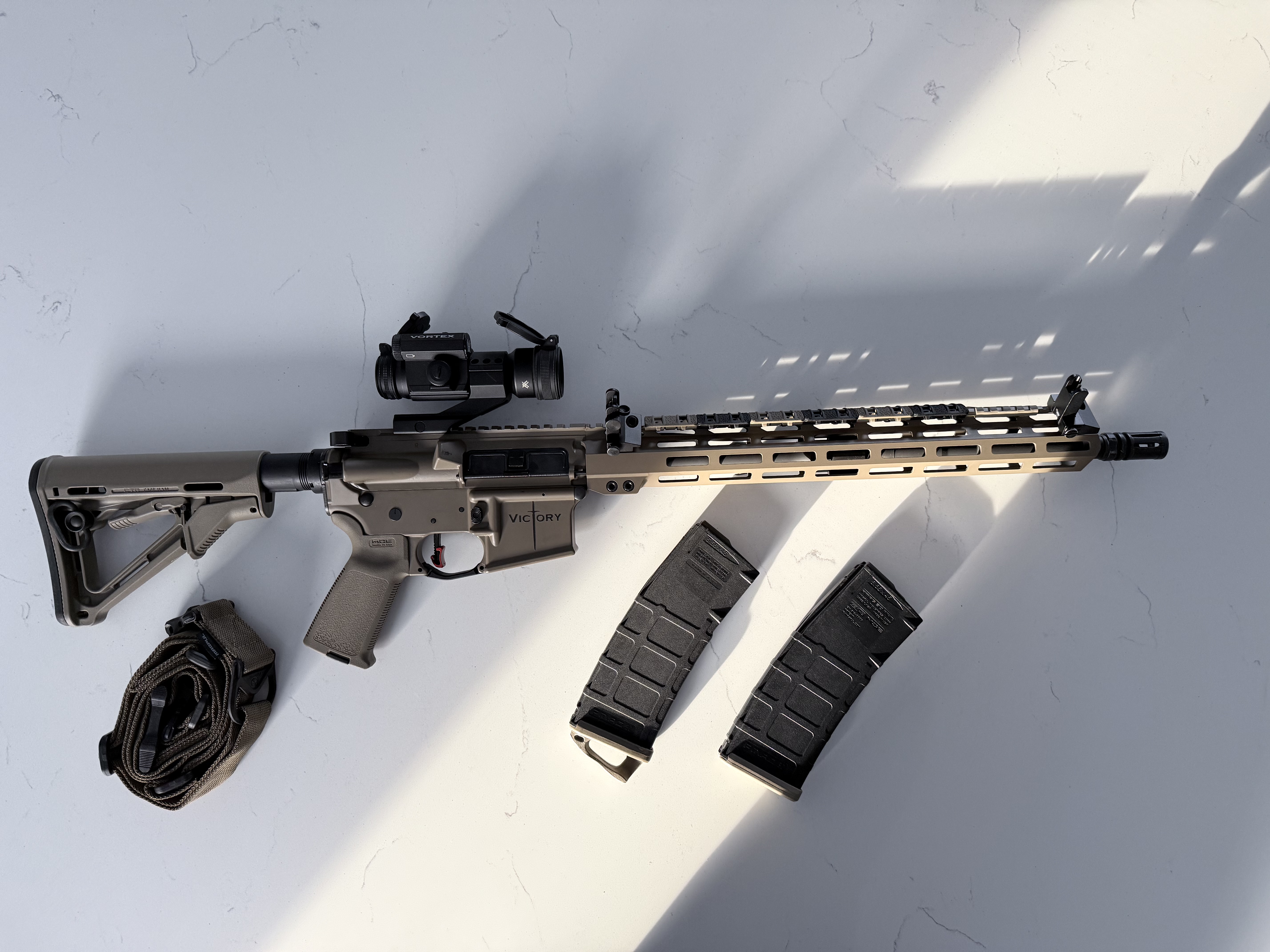 Full Spectrum Armory AR-15 in 5.56 Vortex Strike Fire red dot. 45 degree offset iron sights. Nickel Boron BCG. Ambi-Charging Handle. Magpul stock, sling, firing grip, and rail covers. Hyper Fire Competition Trigger. 2-30rd Magpul Magazines $1100.00 No felons No Trades No out of state transactions.
