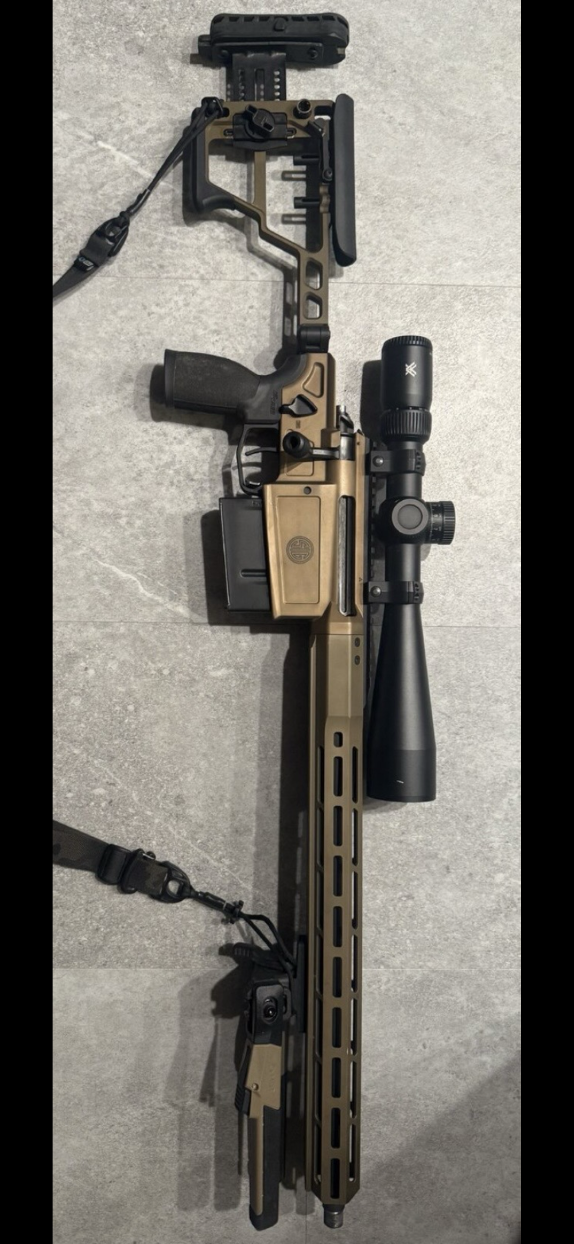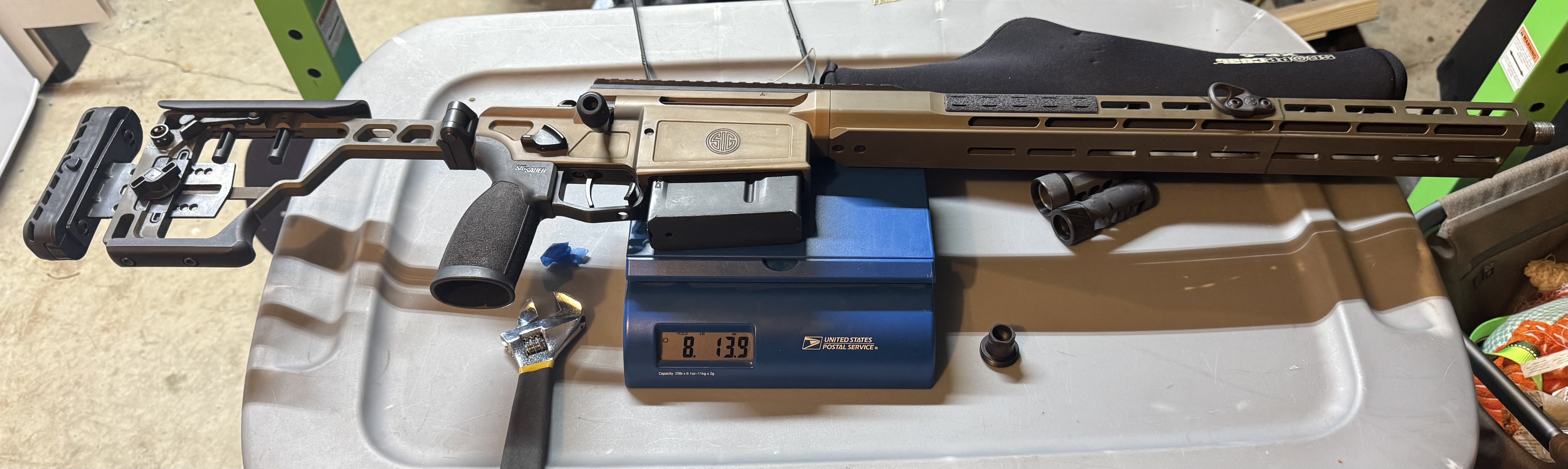 Sig Cross Magnum in 300 win mag. Comes with 1 6 round magazine. Scope, rings, and suppressor are not included. About 200 rounds have been fired through the barrel. The medium contour factory barrel has been cut down to 18” and rethreaded 5/8x24. It’s sub MOA using Hornady Precision Hunter 200gr ammunition. The 17 inch rail has ARCA and MLOK capability to mount accessories. Weight is 8lb 13.9oz with the empty magazine.