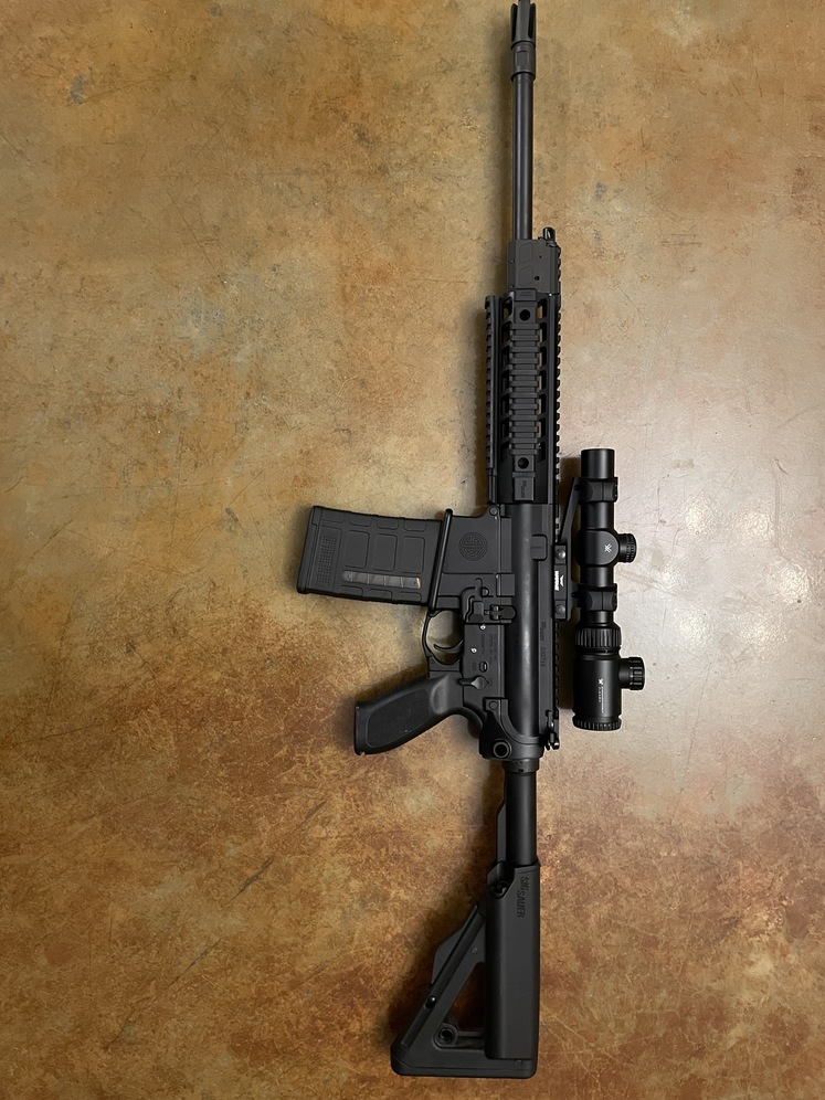 Like new Sig Sauer Sig716 in 308 caliber with a Vortex Crossfire ll 1-4 power scope. Have some ammunition to go with it.