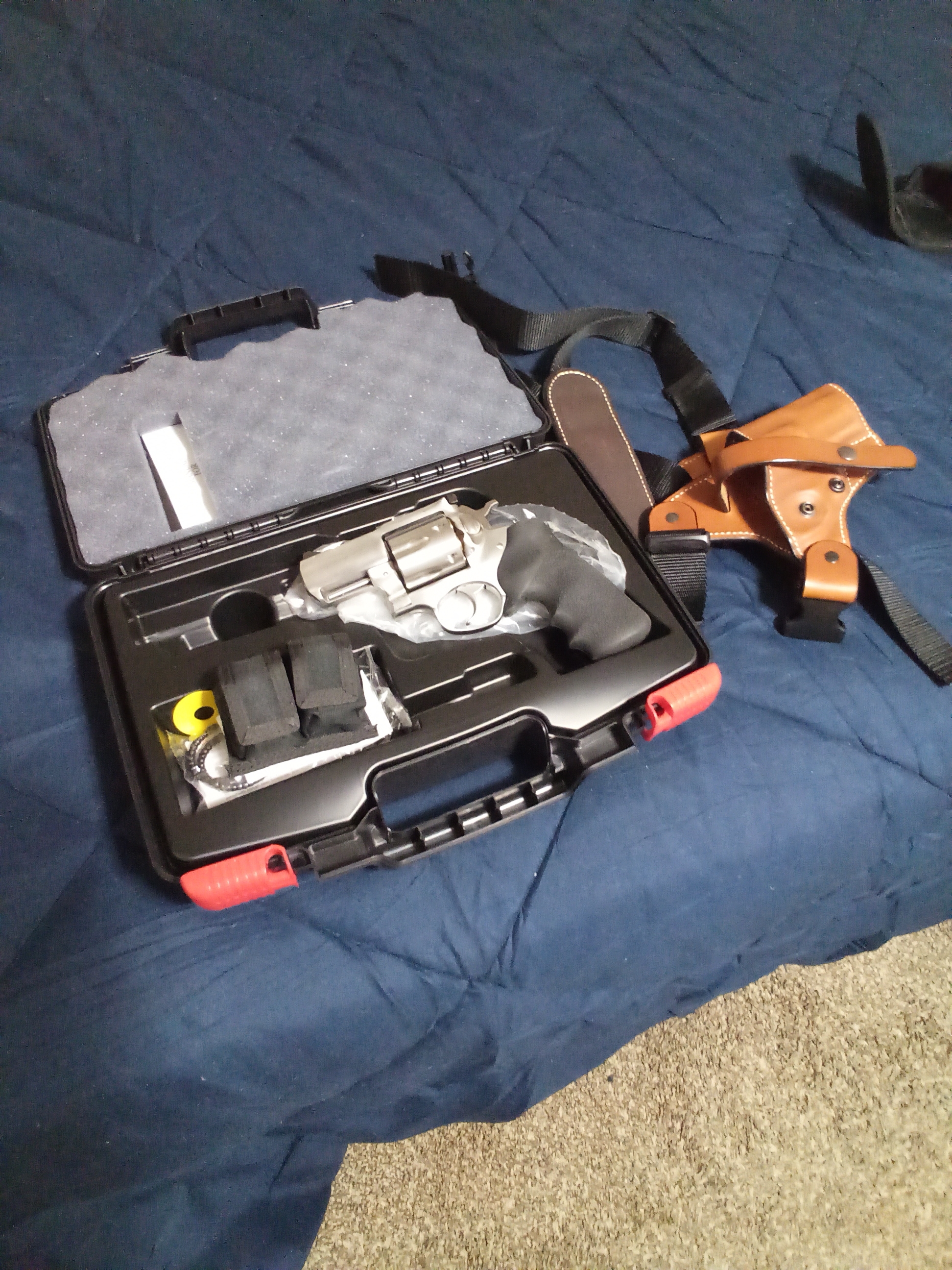 New ruger alaskan 44 mag with galco right hand draw leather chest holster, two speed loaders with pouch.