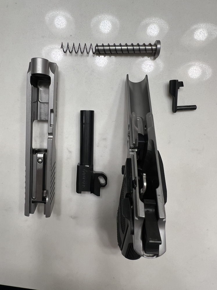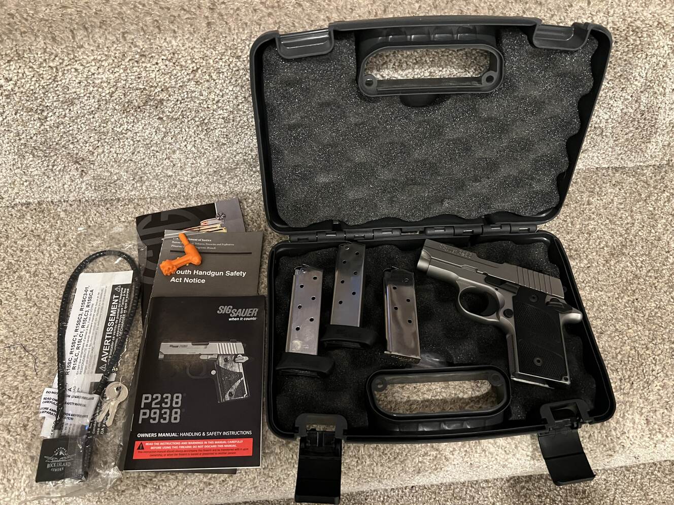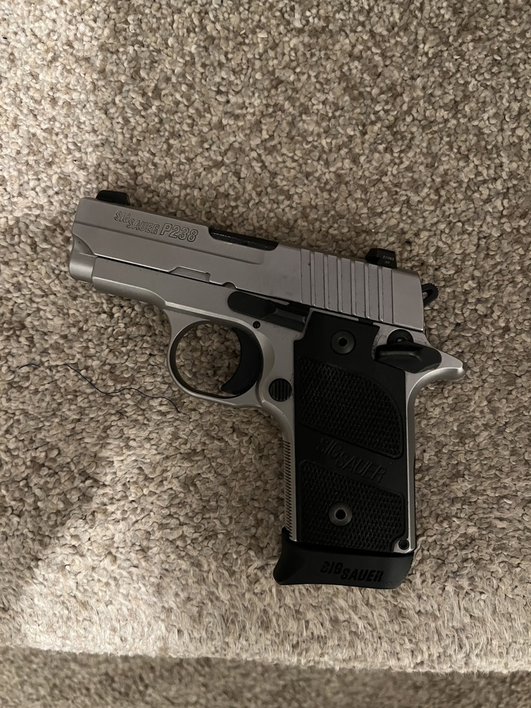 Sig P238 stainless steel. This is the HD version with a steel frame. It weighs 5oz more than the aluminum frame versions which makes it one of, if not the softest shooting .380 on the market. A couple unique features: You can run the slide with the safety on to clear the pistol. You can fire a round without the magazine in the pistol. If you’re a 1911 fan and are in the market for a pocket pistol this is tough to beat. If you lack hand strength to rack most slides or you just don’t like recoil this would be an excellent choice for you. Includes tritium night sights, a kydex IWB holster, original box, paperwork, one 6rd mag and two 7rd mags. Super clean and low round count.