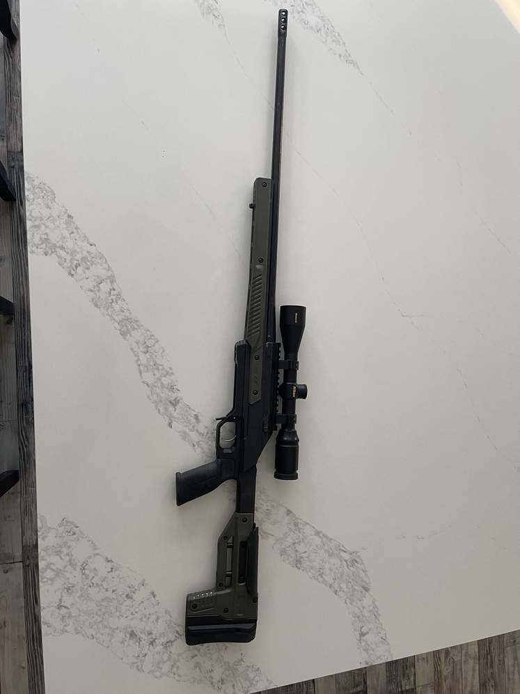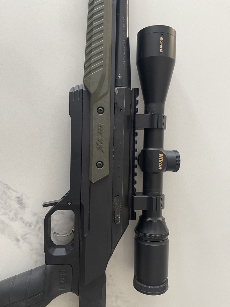 Tikka T3 300 win mag on oryx chassis with muzzle brake and Nikon monarch scope