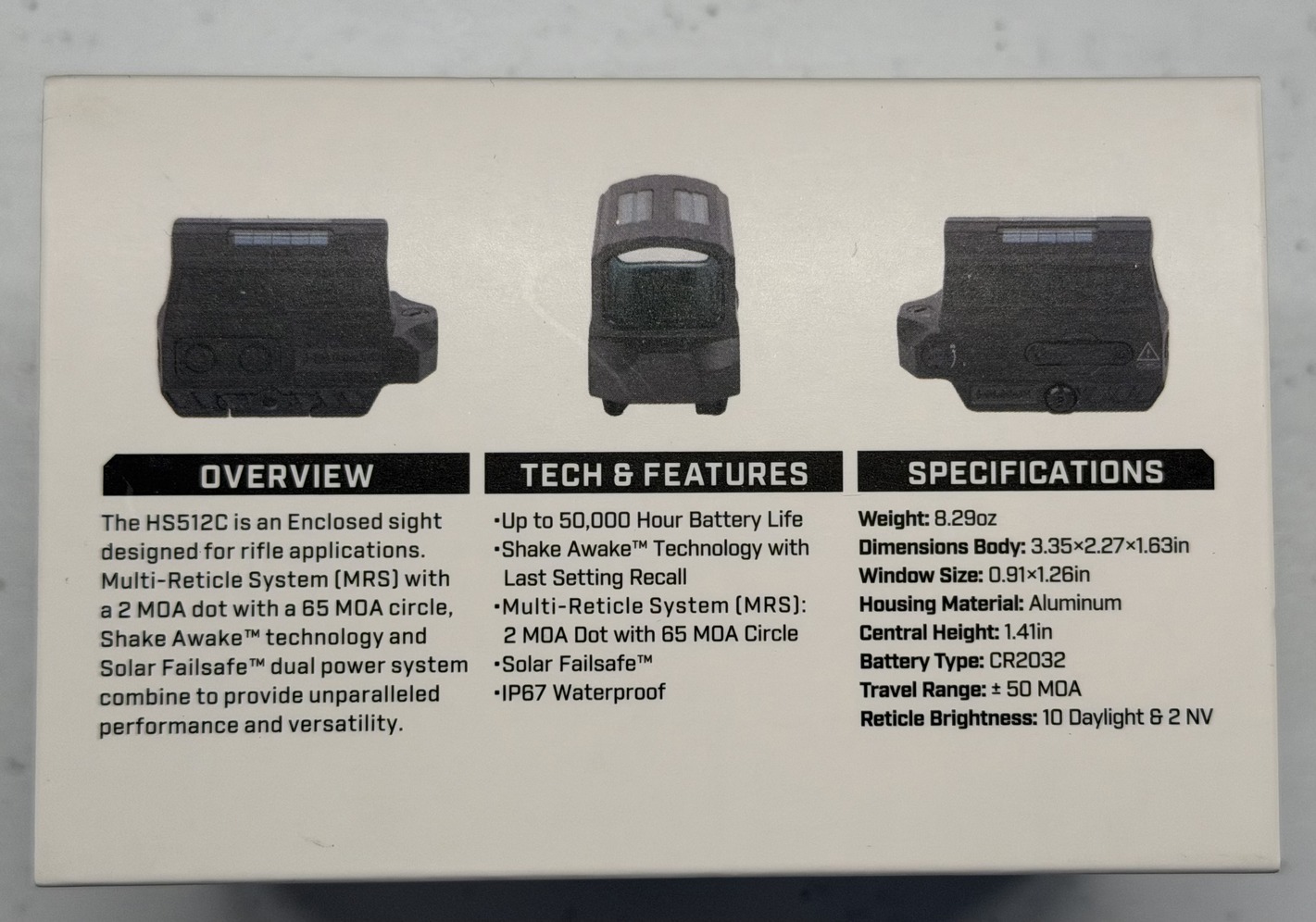 The HS512C is an enclosed reflex optical sight designed for rifle and carbine applications. It comes equipped with Holosun’s exclusive Solar Failsafe Technology which utilizes integrated solar panels to constantly charge the batteries. This design ensures the optic always has a backup power source even in the event of a dead battery, and reticle intensity is automatically adjusted based on the amount of light the solar cell receives. The HS512C’s reticle is composed of a 2 MOA dot in the center of a 65 MOA circle to promote faster target acquisition without sacrificing accuracy. The optic’s Multi-Reticle design also allows the user to choose a 2 MOA dot only for making more precise shots. Other features of the HS512C include Holosun’s ShakeAwake Technology that instantly activates the optic when movement is detected, making the optic always at the ready.