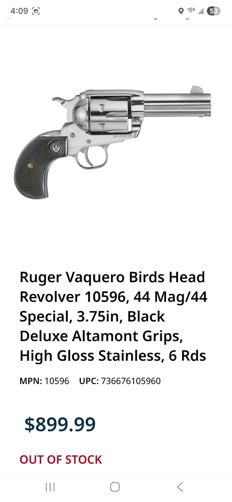 Ruger Vaquero 44 Magnum. Stainless, Birds Head. Very nice. Comes with a good holster, cross draw or strong side. (RH) 750 Bucks.