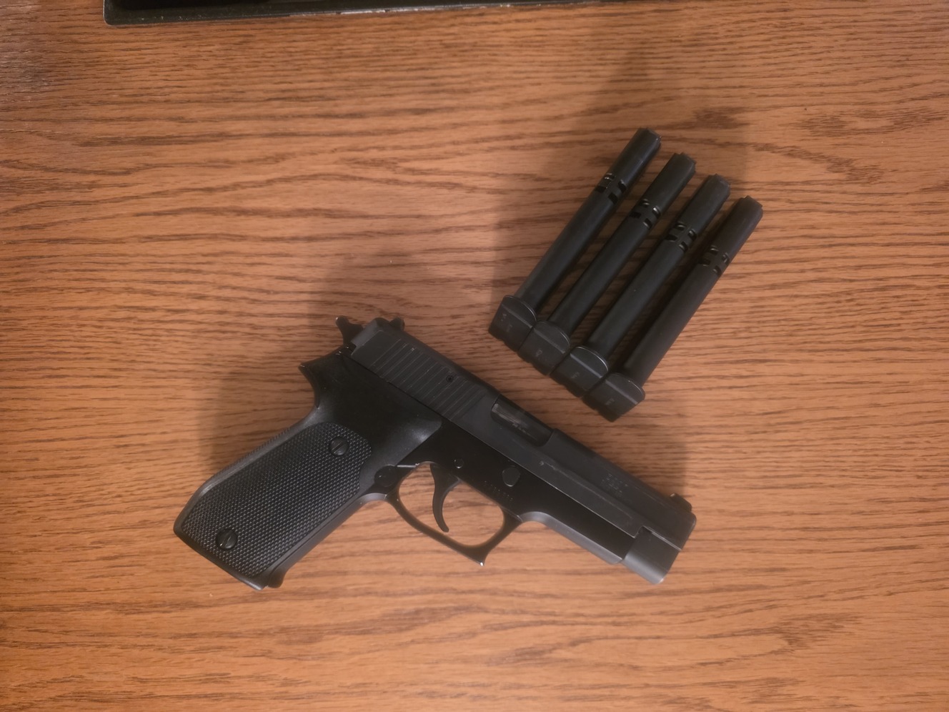 Made in Germany Sig Sauer P220 .45ACP. Great handguns. Very well balanced. Finnish has the usual wear, not too bad. Double action, single action. Comes with 4 magazines. 600 Bucks