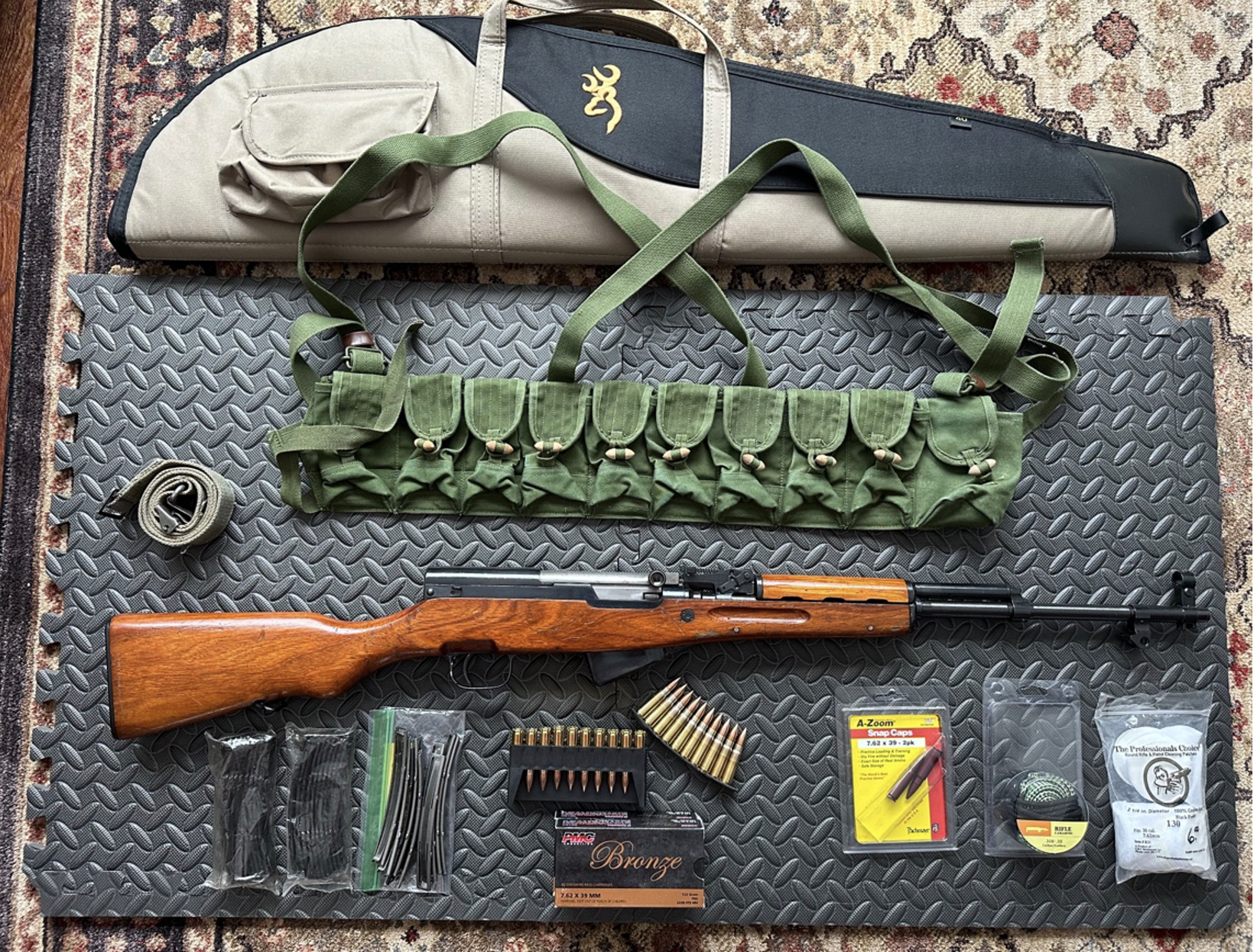 Norinco SKS rifle/carbine – Great condition. The arsenal factory mark is an upside-down triangle 3. Probably made in the 60’s or 70’s. Great condition: Blueing 95% or better (no rust). Wood stock (non-laminate) light color shellac. The bore is chrome-lined with sharp rifling. A bullet inserted from the bore shows very little wear to the rifling. Mechanically excellent condition. Has not been fired much since it arrived in the U.S. as shown by cosmoline here and there. It does not have the chi-com spike bayonet, cleaning rod, or the oiler in the stock. Price includes Chinese ammo chest rig, 40 rounds of PMC brass-cased ammo, 2 snap caps, 30 stripper clips, .30 bore snake, patches, sling, and rifle scabbard.