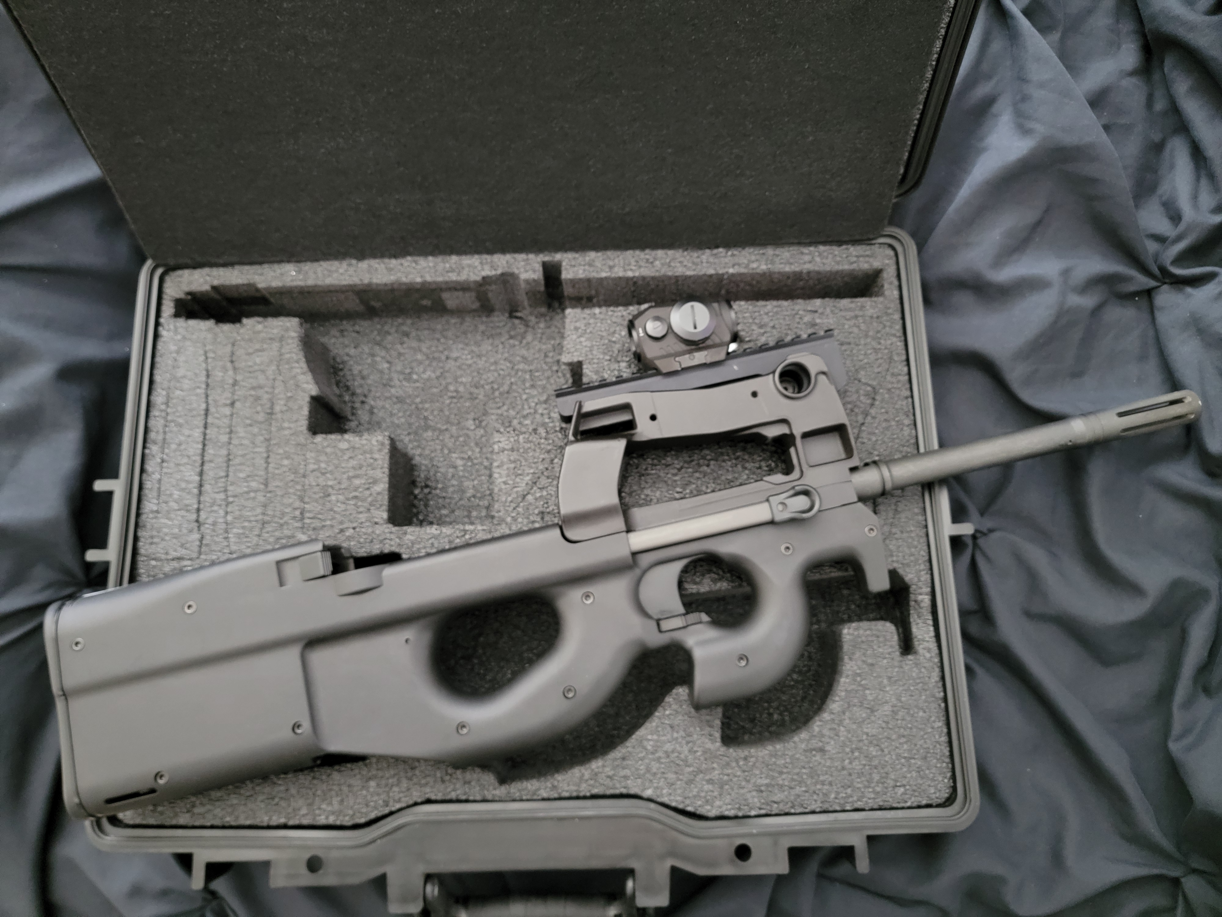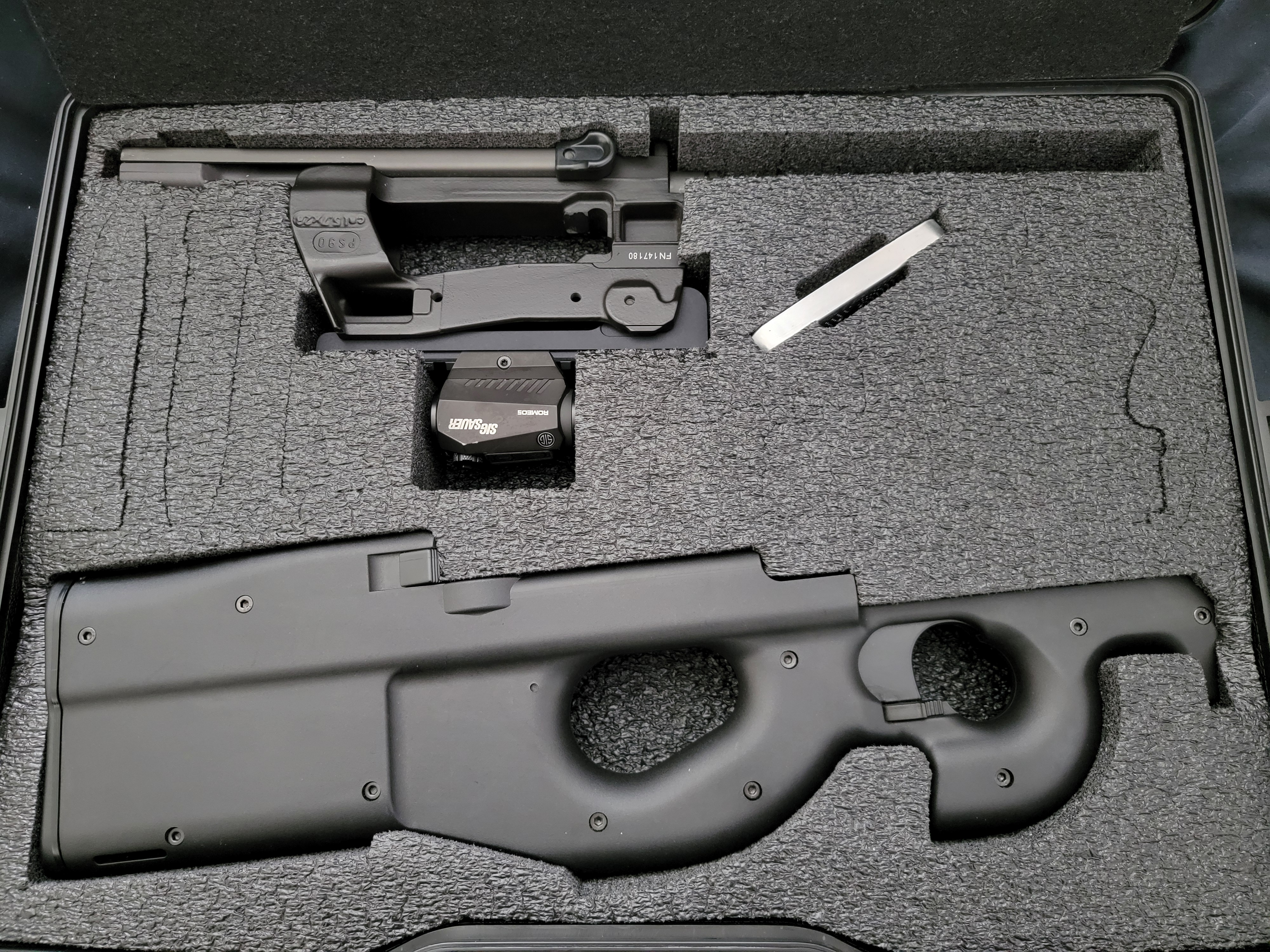 FN PS90, 5.7x28mm. Included in the price are 6 OEM 50 round mags, the case that holds 5 mags and the gun itself, as well as the Sig Sauer Romeo5 1x20mm illuminated 2 MOA red dot gun sight. I reside in Eagle River but am willing to meet in Anchorage, Palmer, or Wasilla to sell.
