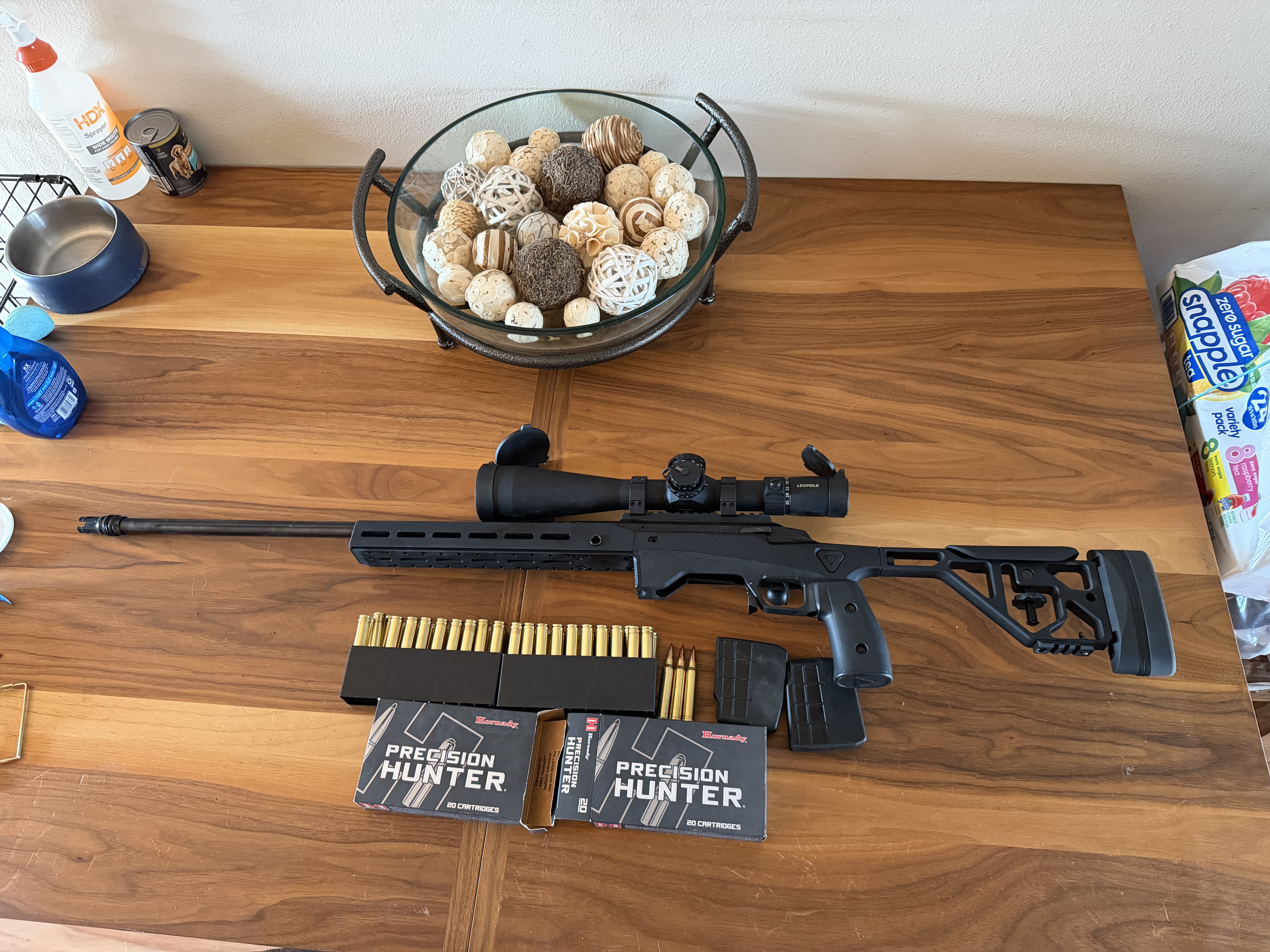 New Tikka T3X Ace 300WMG. It has two mags and 43 rounds that come with it. Upgraded Timney trigger, rugged silencer ready muzzle break, night force scope rings, and a leupold MARK 5HD 7-35X56 M5C3 ILLUM. FFP TREMOR 3.