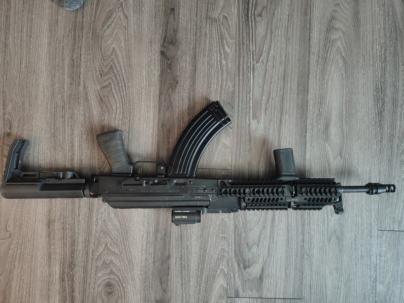 Arsenal SLR107R that has had the barrel chopped down to 14.5" with a pinned and welded dead air key-mo muzzle break, done by Weapon Genetics. a Barwar USA picatinny quad rail hand guard installed, Atero Arms Red dot mount installed with a primary arms red dot that has the Chevron retical and the bullet drops for 7.62x39. ALG trigger installed. Tango down AK grip. AR buffer tube adapter with AR stock. I have nearly 4500 into this rifle and I know I won't get that much out of it, but it is a stamped arsenal AK of which there are only so many left, and for anyone looking for an "Alpha" type AK but doesn't want to put the work into making one, this is a great option. Asking $2,000 OBO