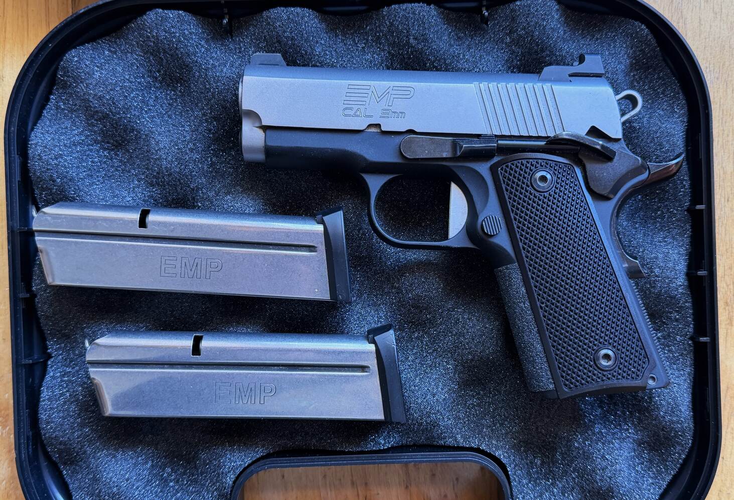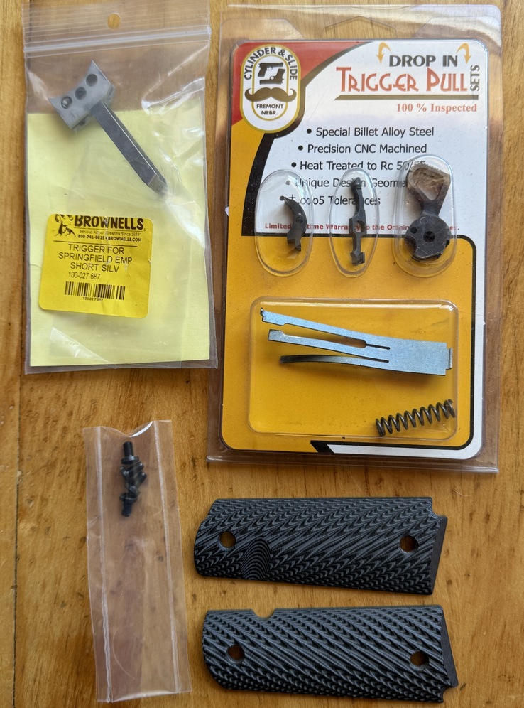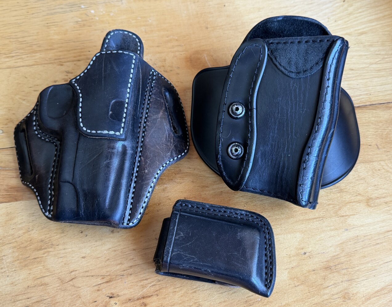 This pistol is in excellent condition. I've had it for years, carried a lot, fired less than 100 rounds. Due to a hand injury I needed a gun with a small grip frame, which this one has. I also added a short trigger and Alumagrips thin aluminum grips (all original parts included). Other mods include a Cylinder and Slide drop-in trigger pull set, and a Heine two-dot sight set. Package includes a non-original Glock hard case, all ammo pictured (plus about 200 rounds of ball), Diamond D Guide's choice chest holster, Diamond D pancake holster, a Safariland paddle holster, and a Wilson mag pouch, all holsters right hand.