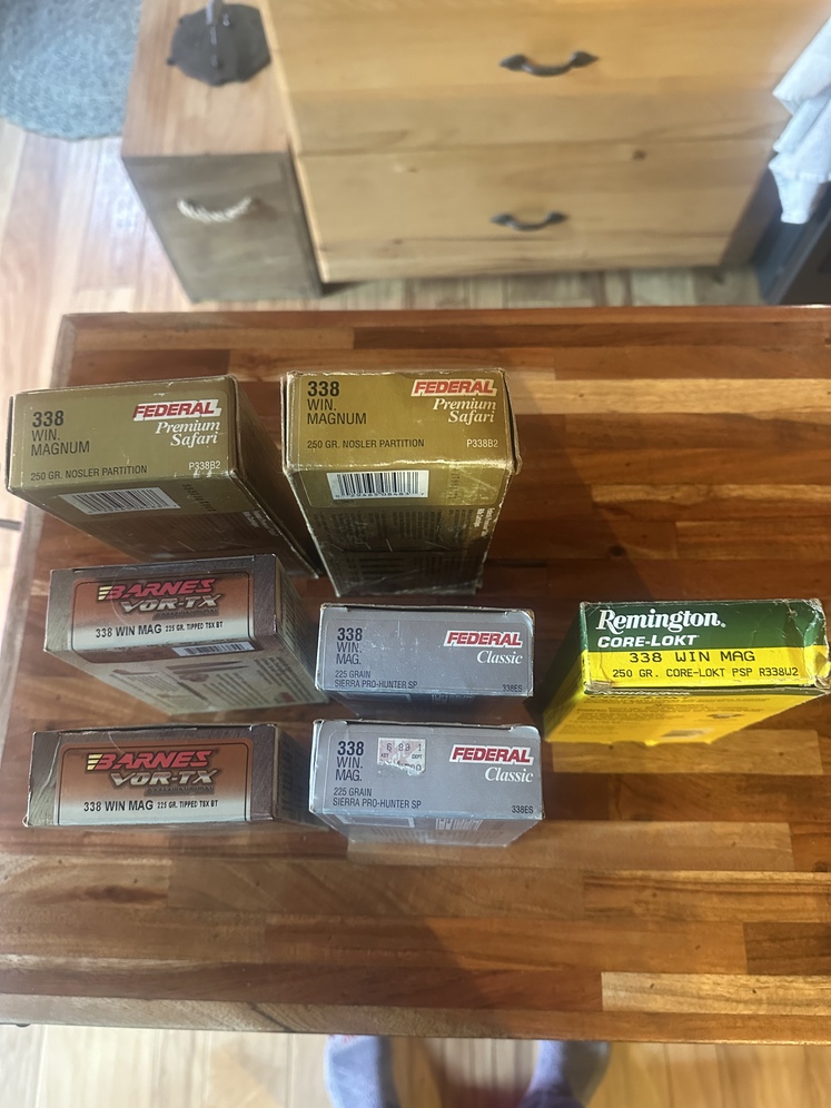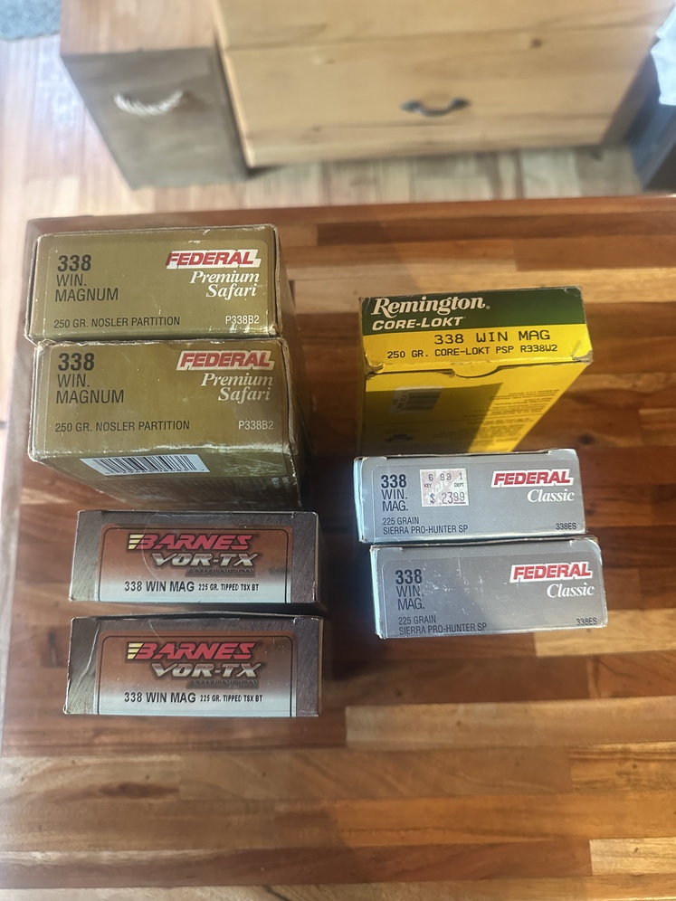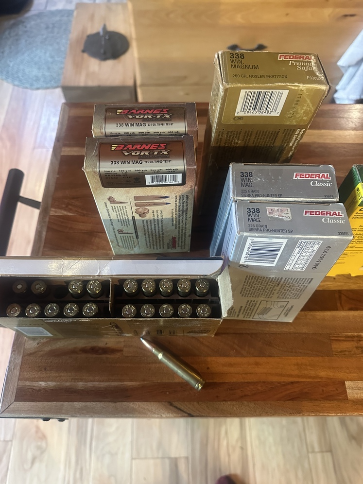 133 factory rounds (6plus boxes) of.338 mag ammo. Mixed. Bixler Partition, barns tipped txs etc. all kept in thermal controlled locker.