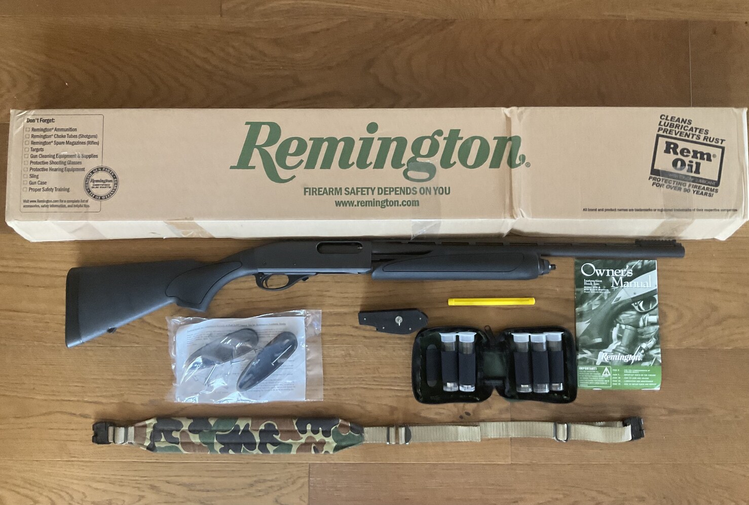 Remington 870 Compact, 20ga. Like new in box. 21 inch barrel, Spacers to adjust length of pull. Five choke tubes from IMP CYL to Super Full. Fiber optic front sight, Must have valid AK ID, cash only.
