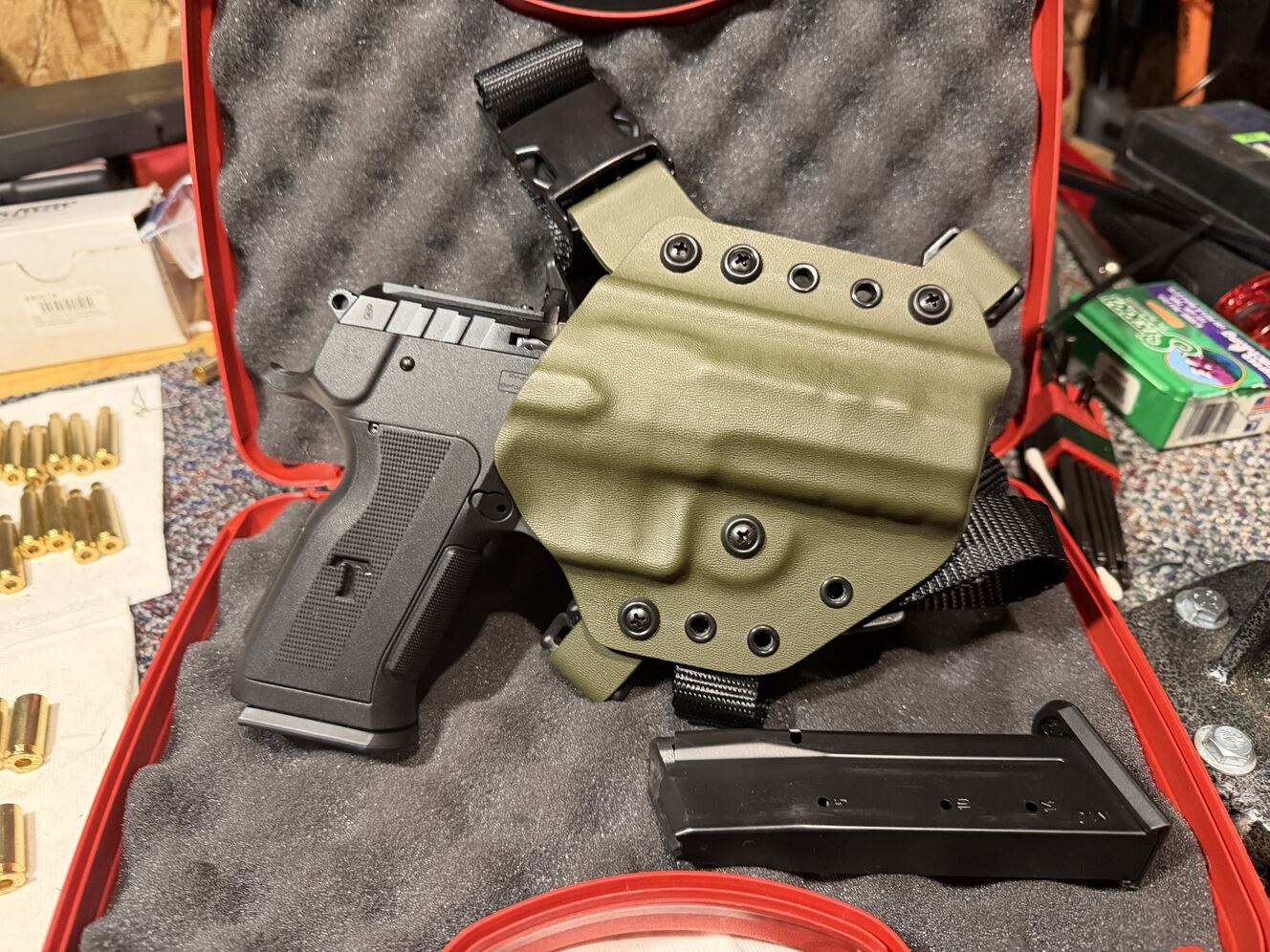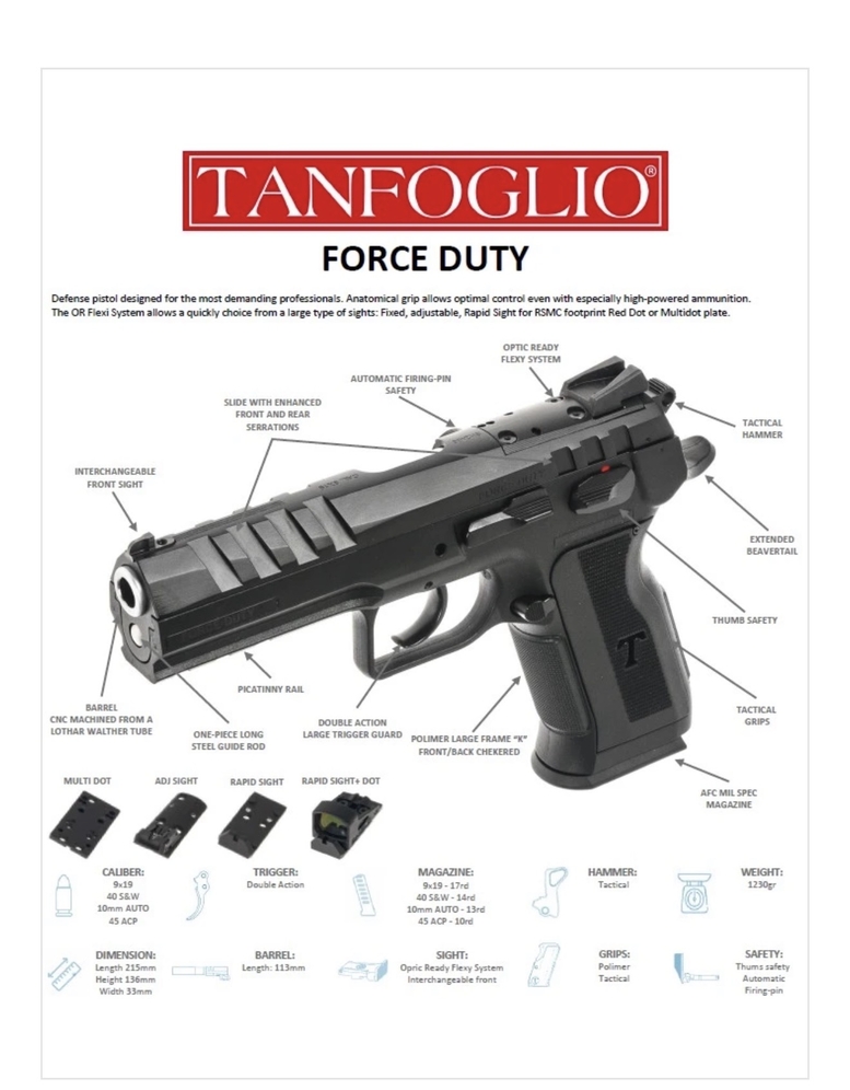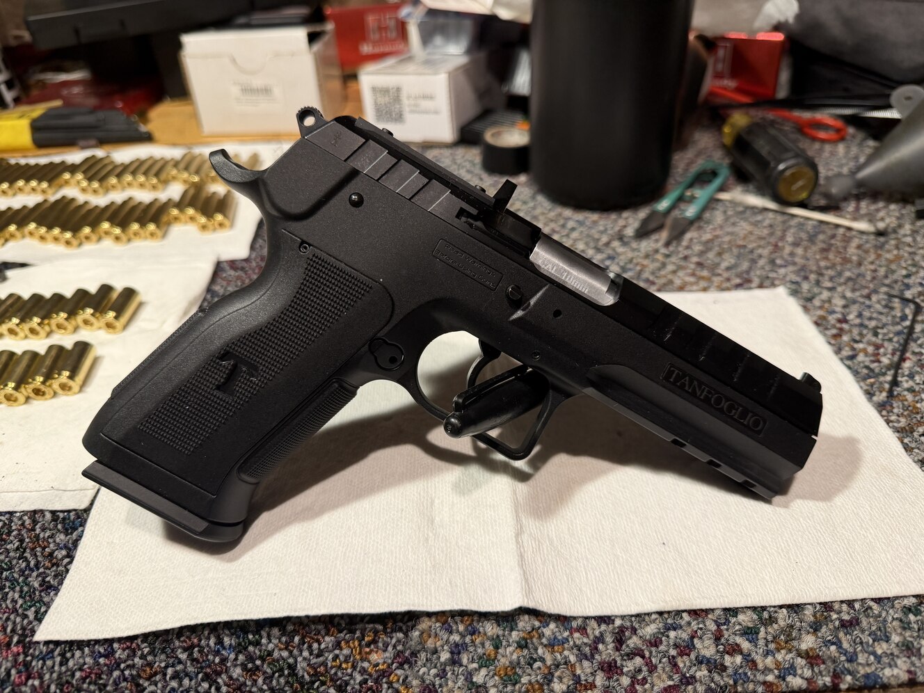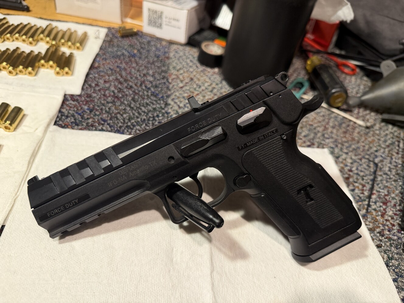 Tanfoglio Force Duty Rapid Sight System 10mm. Very reliable and accurate. Has been mostly a safe queen. Still very new. Has had only about 7 or so magazines run through it. Has a custom Kydex chest holster for woods carry. $675 for the package. Great price, as the holster was $150 alone. Not interested in trades of any kind.
