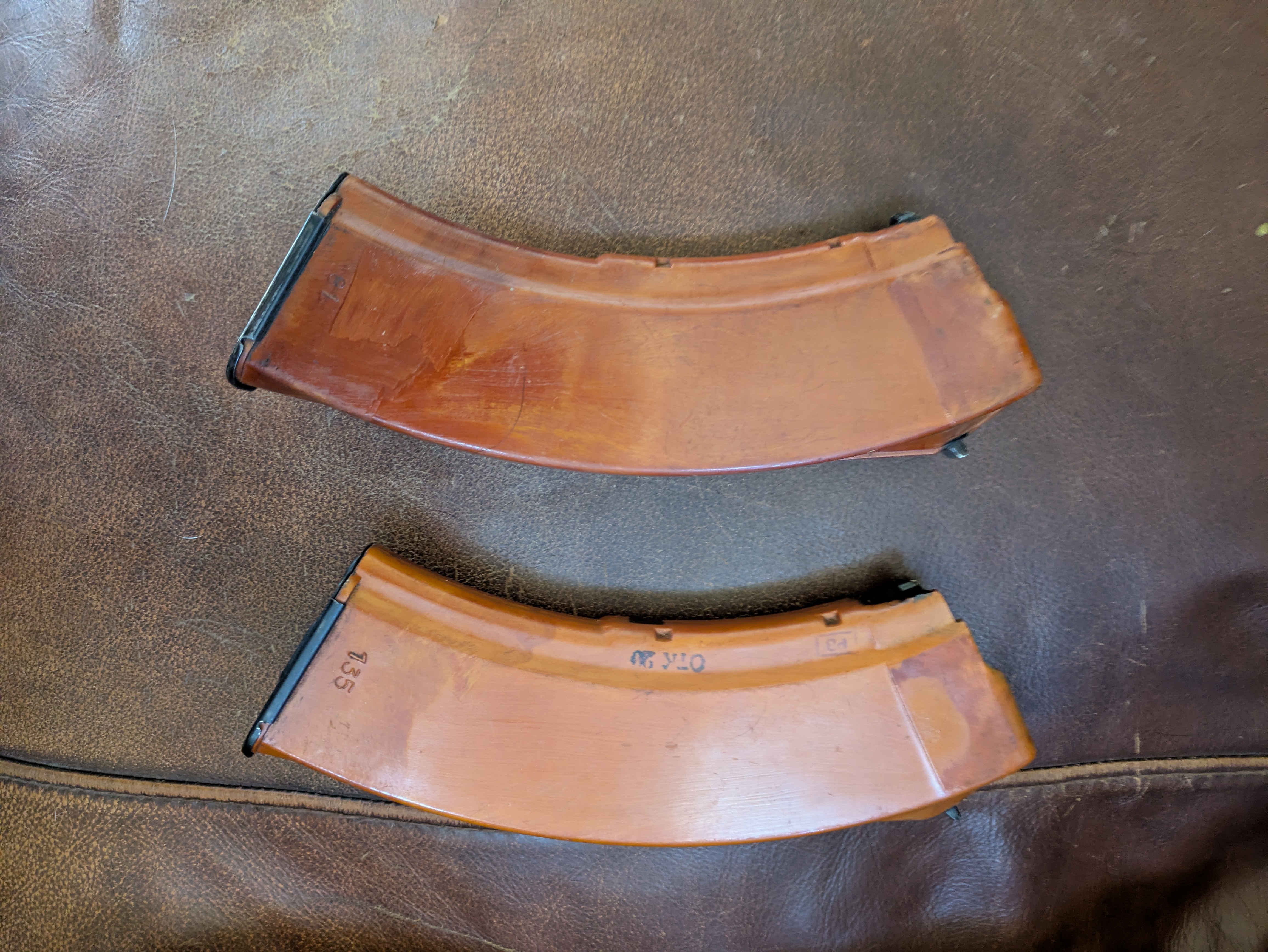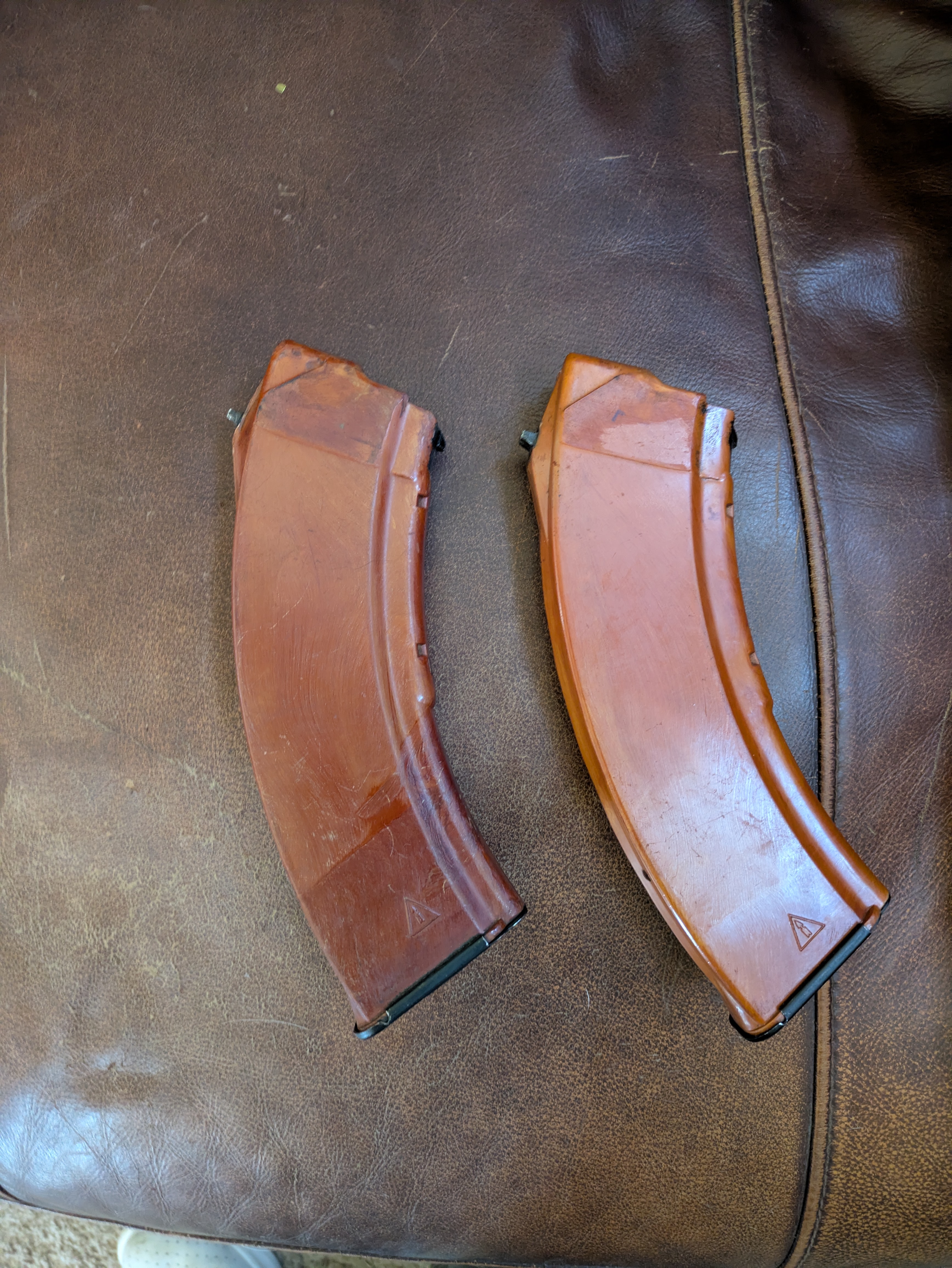 Selling two Russian Bakelite Magazines. Both made by Izhevsk. Meant for the AK47 and the AKM. $100.00 each. Would consider trading for pre-ban AR180 magazines. Text preferred.