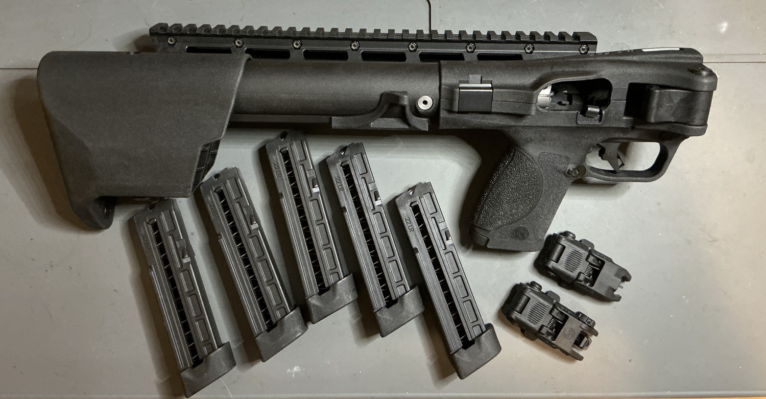 Comes with 5 mags, MBUS folding sights, M&P grip panels, original box. Less than 300 rounds. Located in Anchorage.